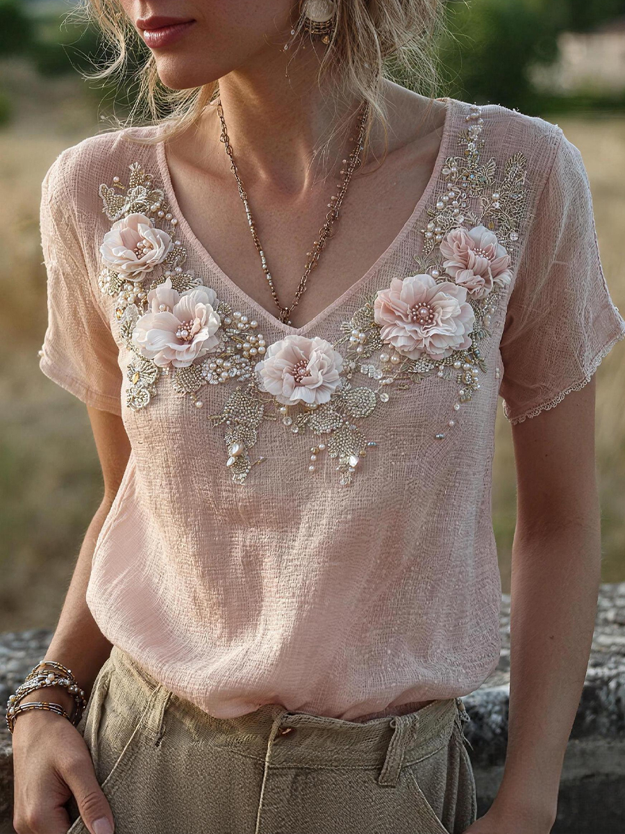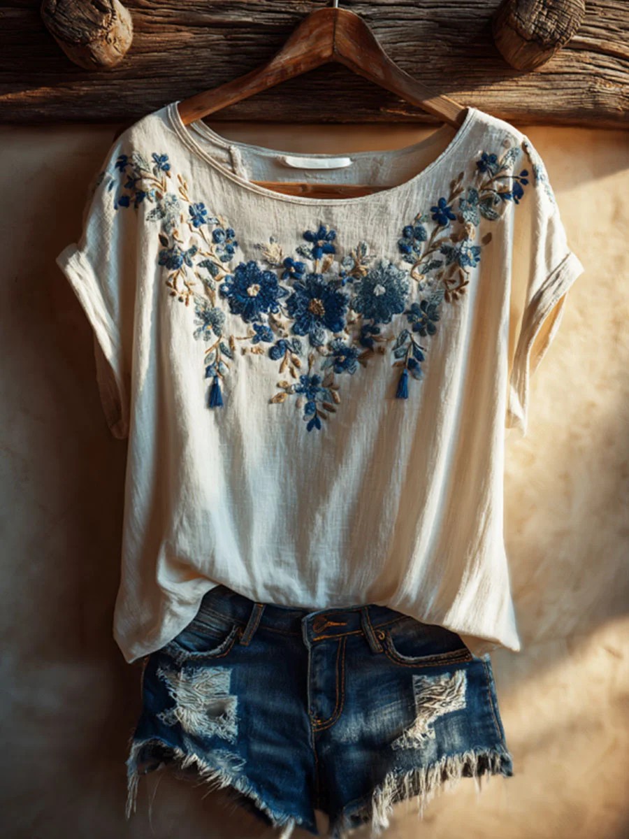 Damen-Blumen-T-Shirt aus Baumwolle und Leinen
