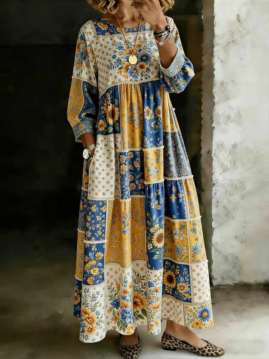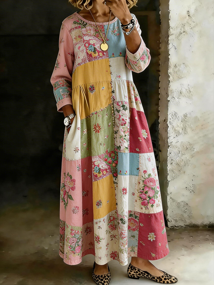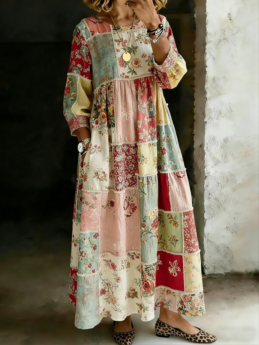 Damen Retro Floral Patchwork Print Lässiges Kleid mit langen Ärmeln