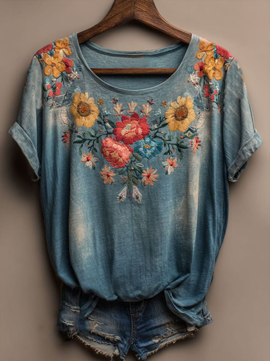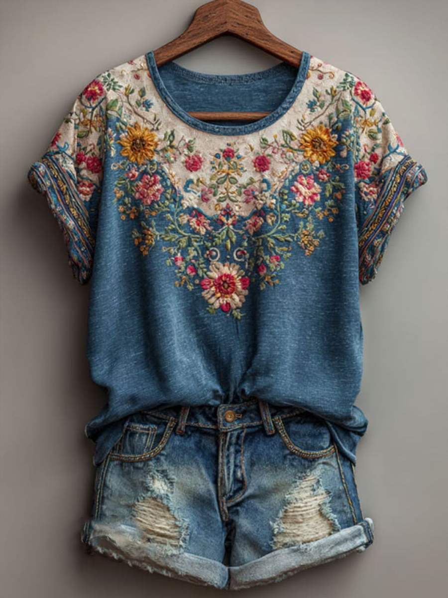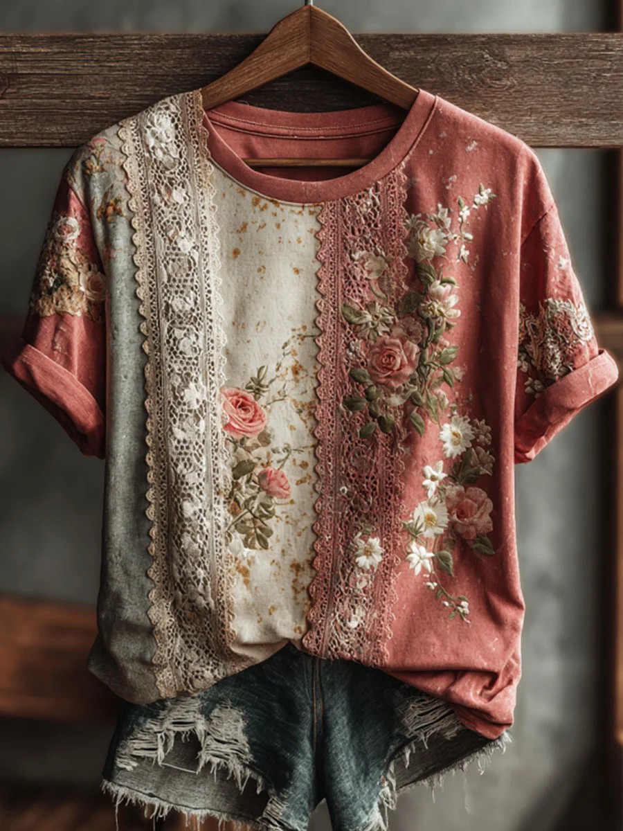 Damen-Vintage-T-Shirt mit Blumen kunst, lässig, kurze Ärmel
