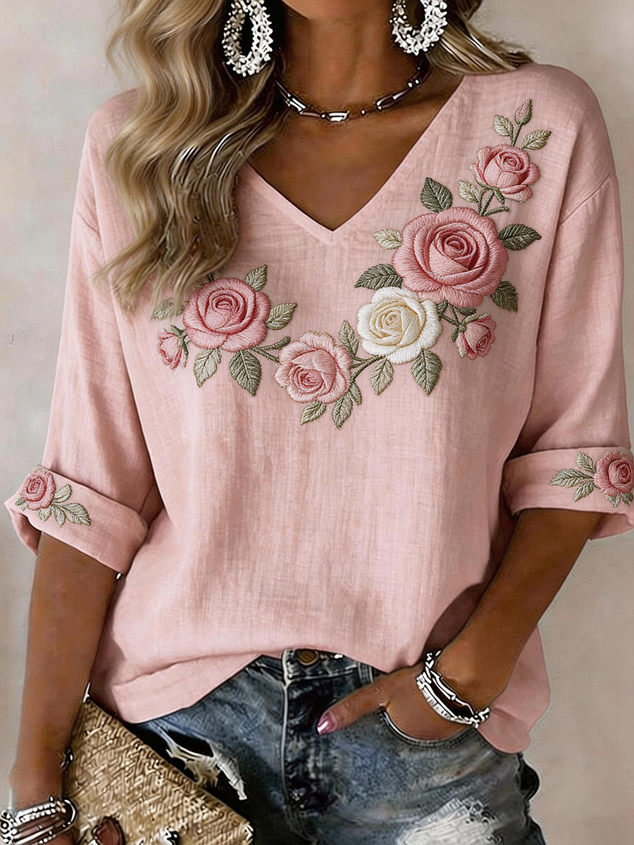 Damen-Blumen-V-Ausschnitt Langarm-T-Shirt aus Baumwolle und Leinen