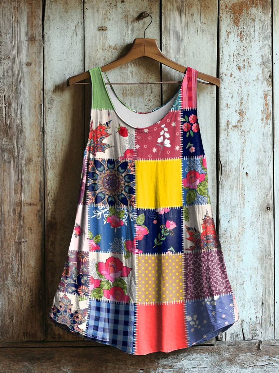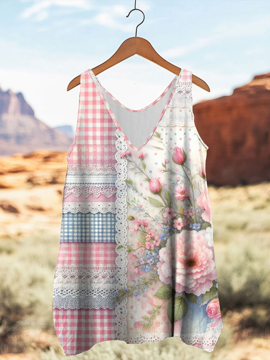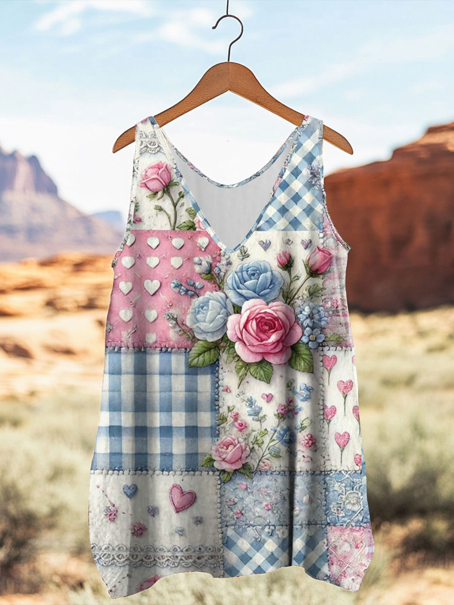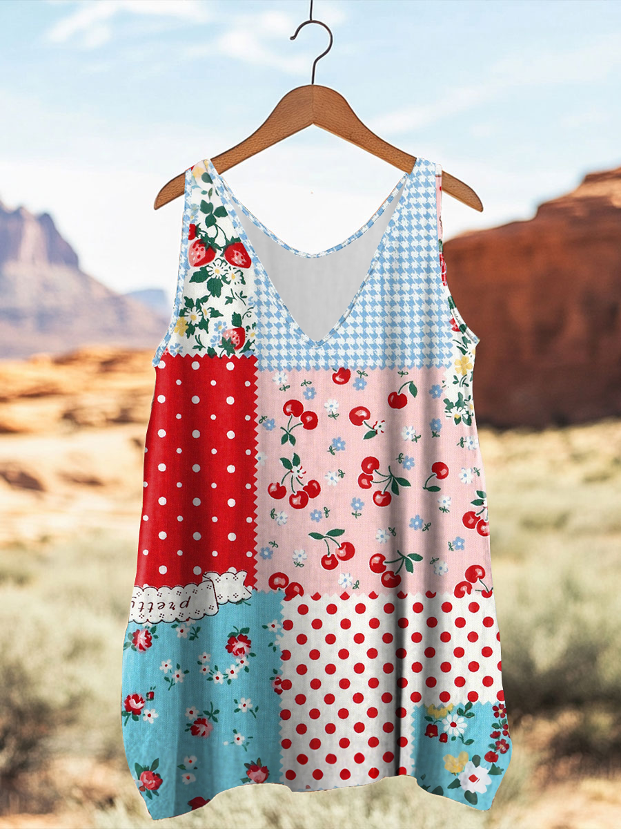 Damen Vintage geometrisches florales ärmelloses Top mit V-Ausschnitt
