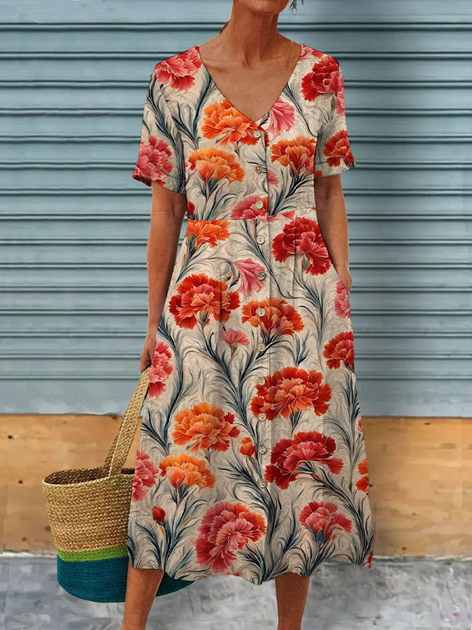 Damen Vintage-Kleid mit V-Ausschnitt und Nelken druck