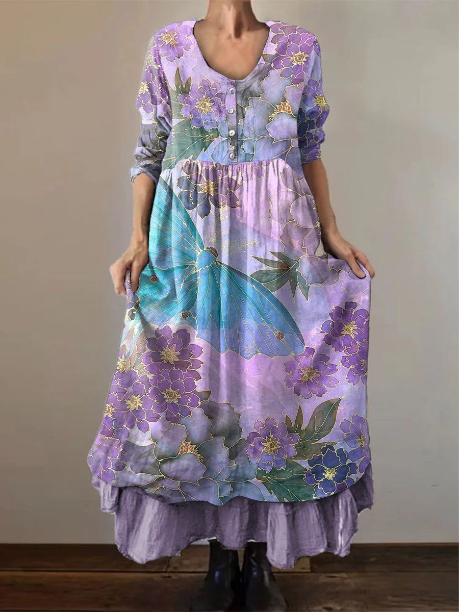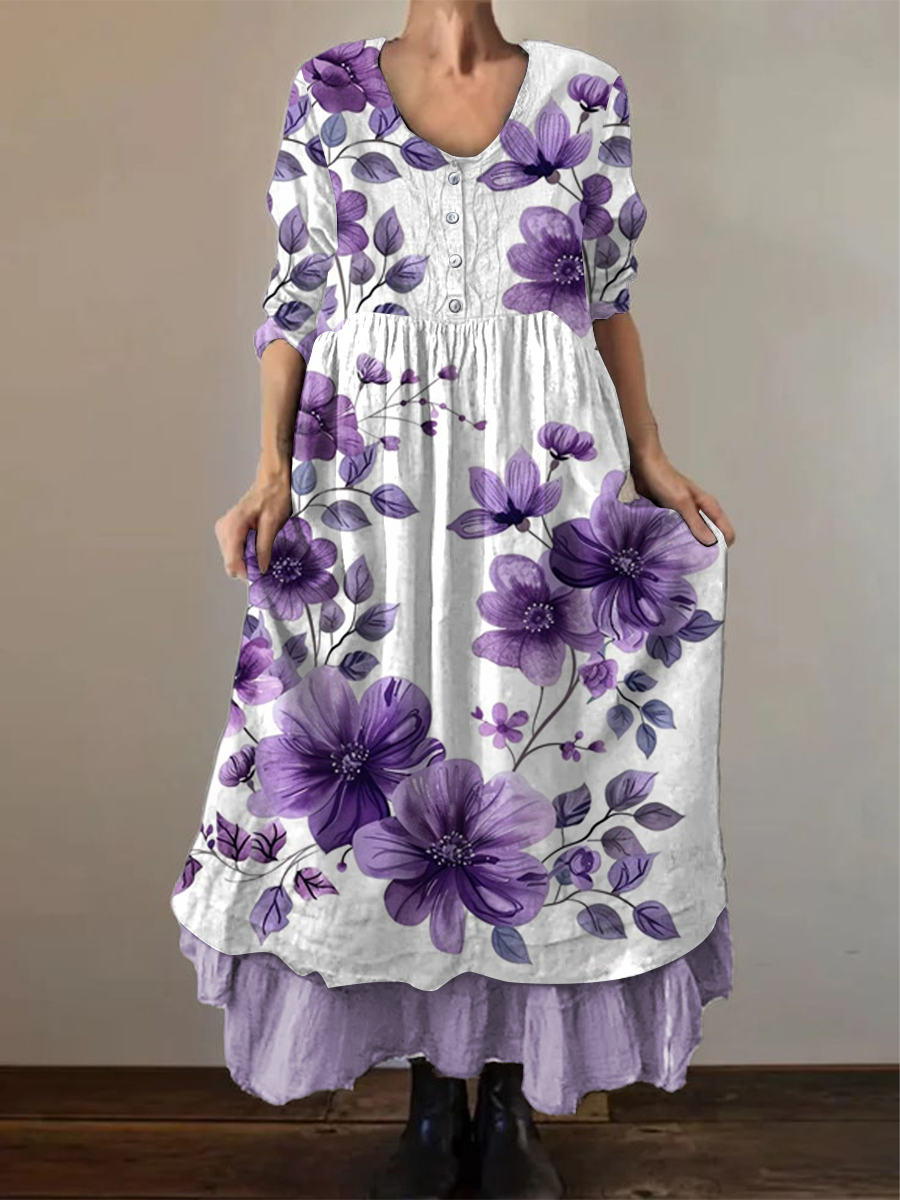 Frauen Alzheimer-Bewusstsein Lila Floral gedruckt Elegant Schick Lose Langarm Zwei schicht iger langer Rock