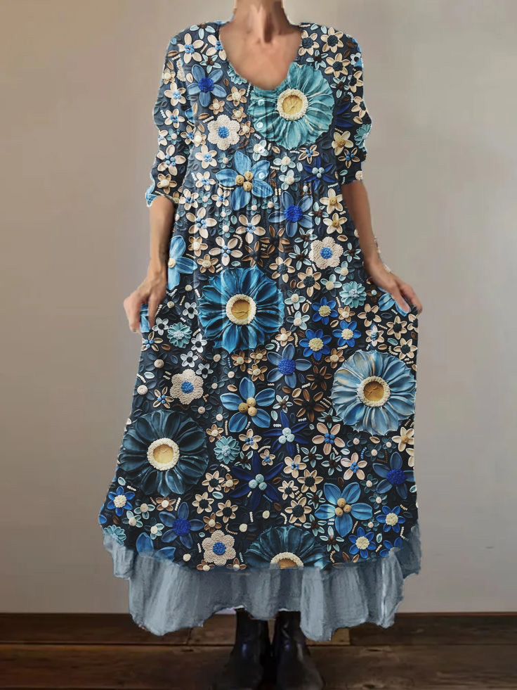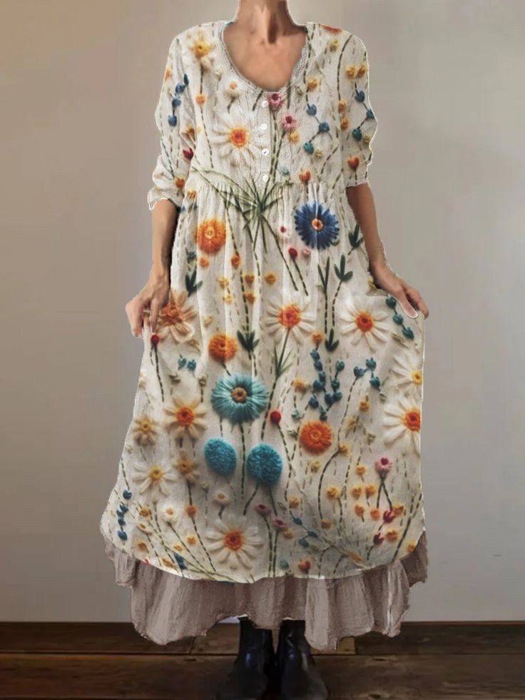 3/4-Ärmel-Kleid mit drei dimensionalem Blumen druck aus Baumwolle und Leinen