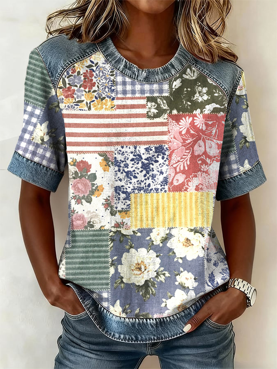 Damen Vintage Blumenmuster Denim Patchwork Top