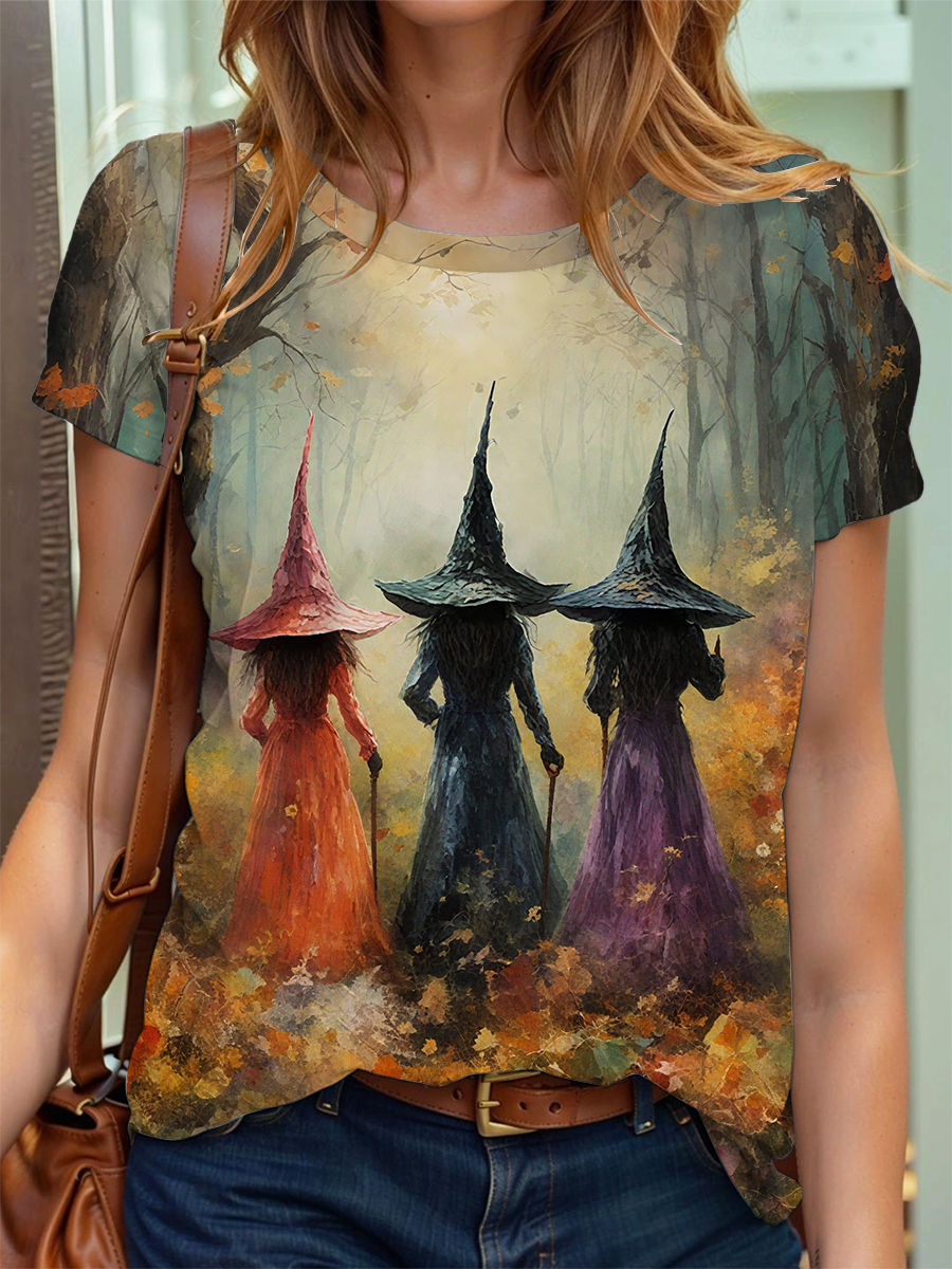 Frauen Halloween Drei Hexen im Vintage Wald Print T-Shirt