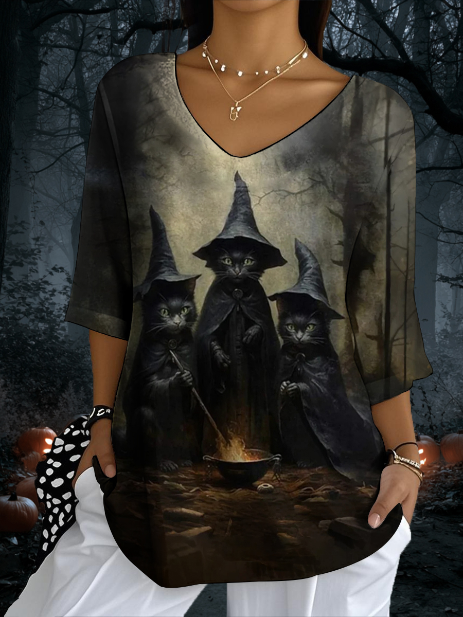 Damen-Hexe-Katzen-Print-Lässiges Half-Ärmel-Top