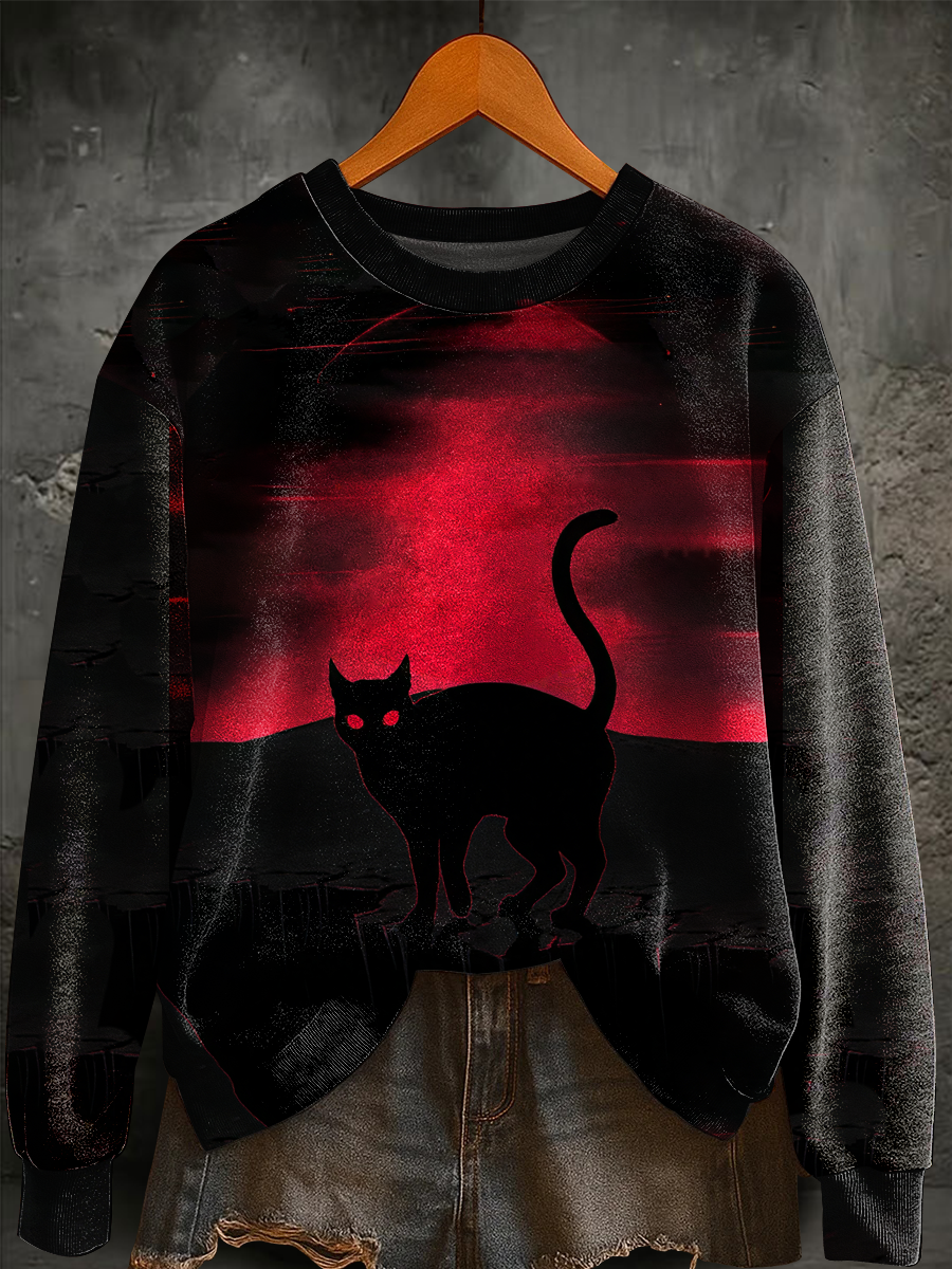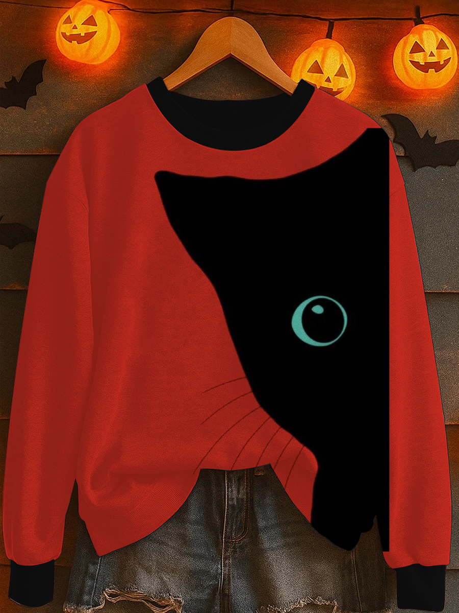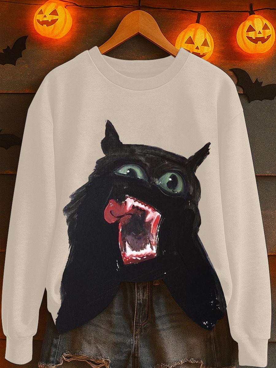 Damen Halloween Black Cat Print gewaschenes Sweatshirt
