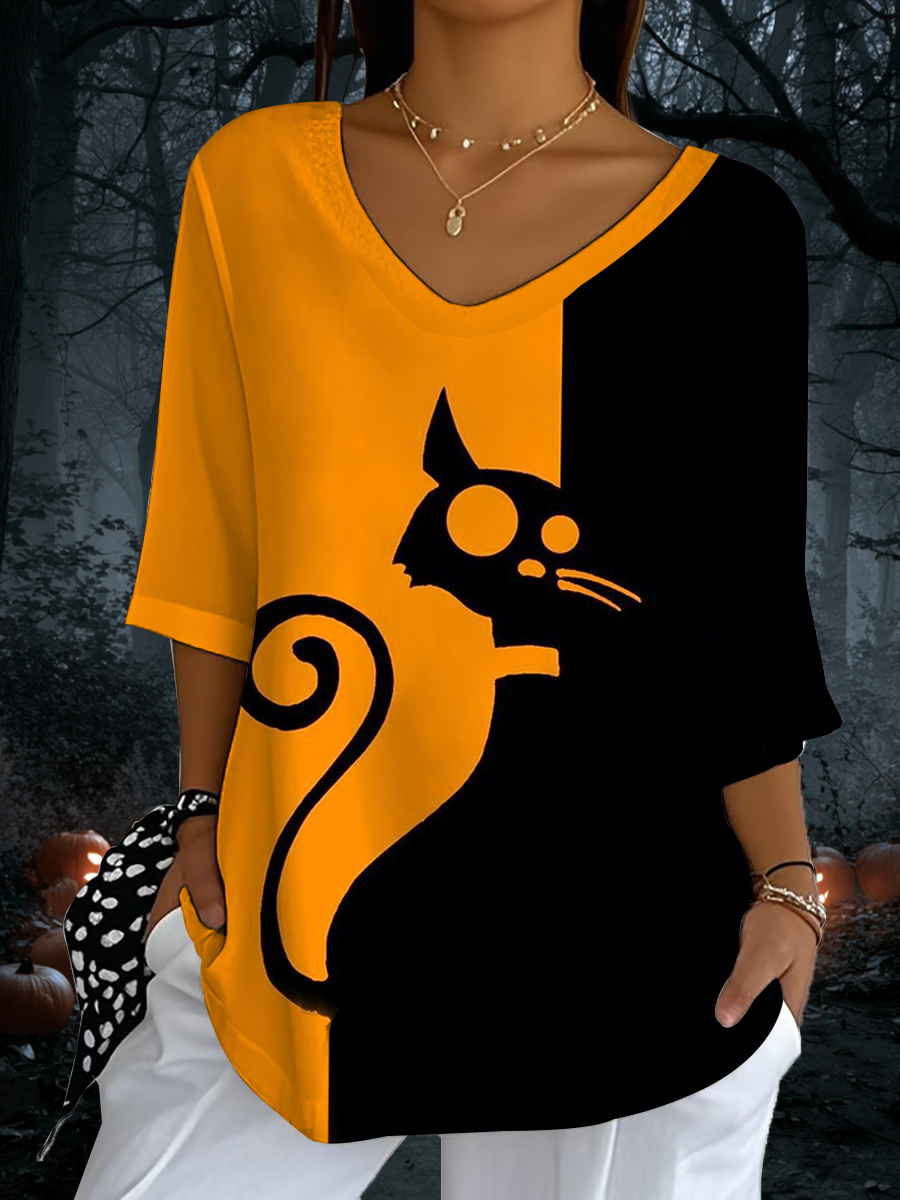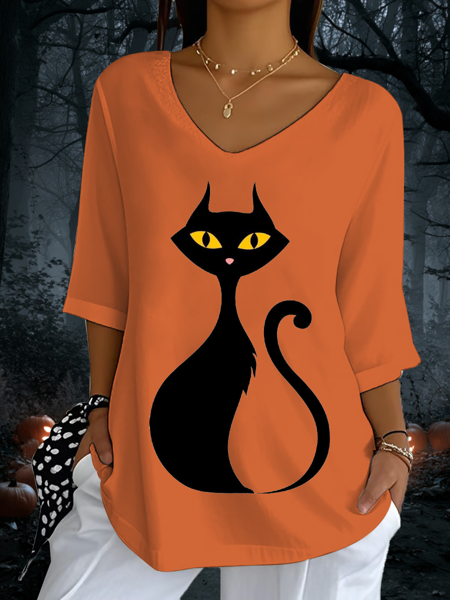 Frauen Halloween schwarze Katze Print V-Ausschnitt T-Shirt