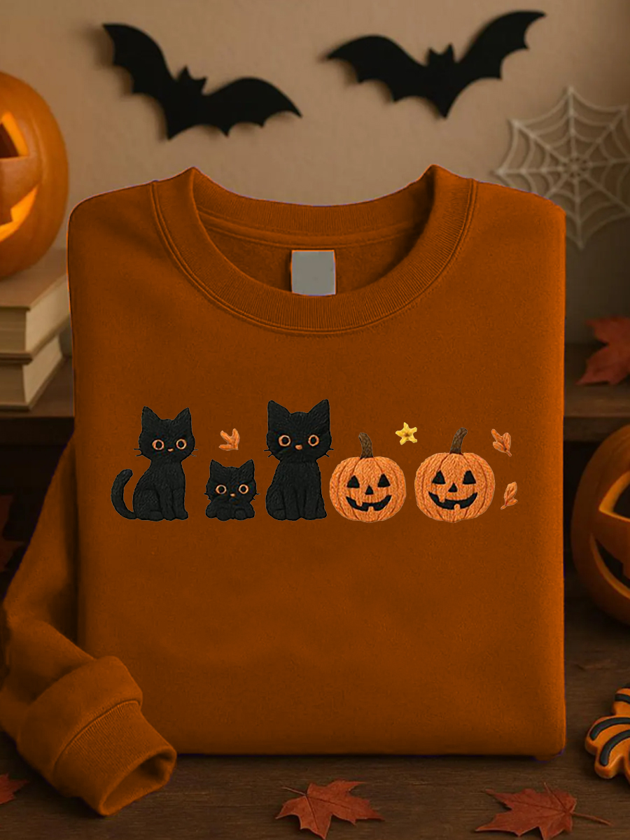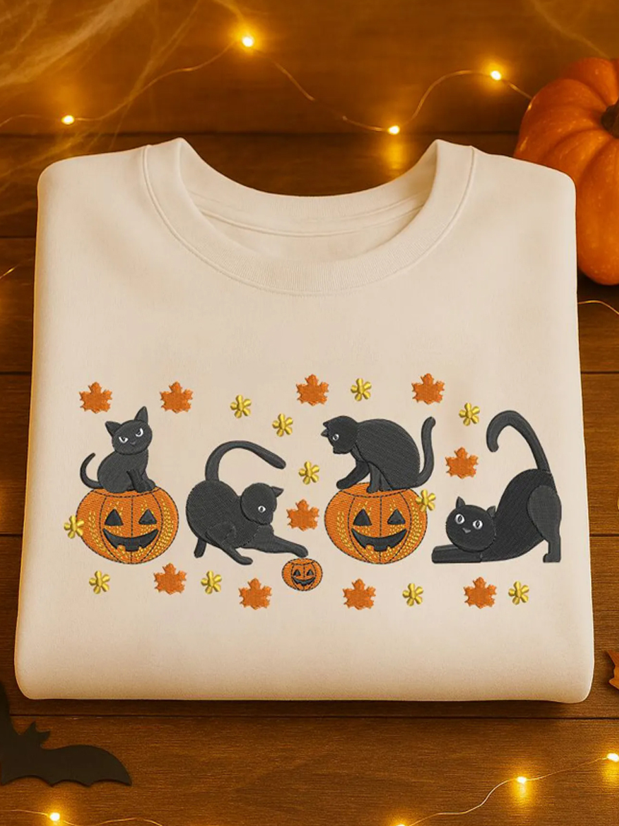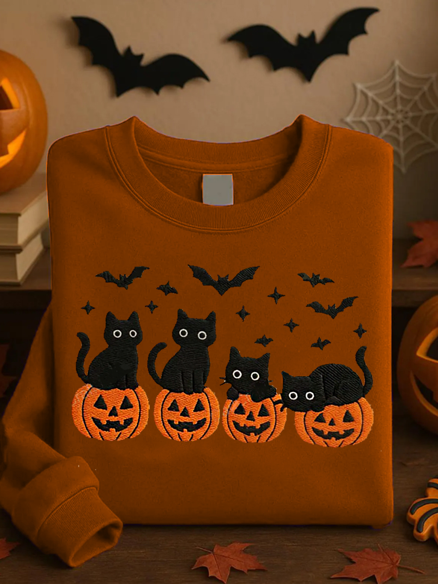 Damen Rundhals Halloween Schwarze Katze Kürbis Stickerei Lose Langarm Sweatshirt