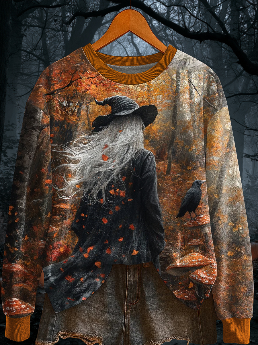 Damen Lässiger Herbst Halloween Wald Hexe Print Sweatshirt