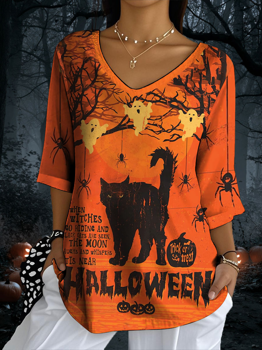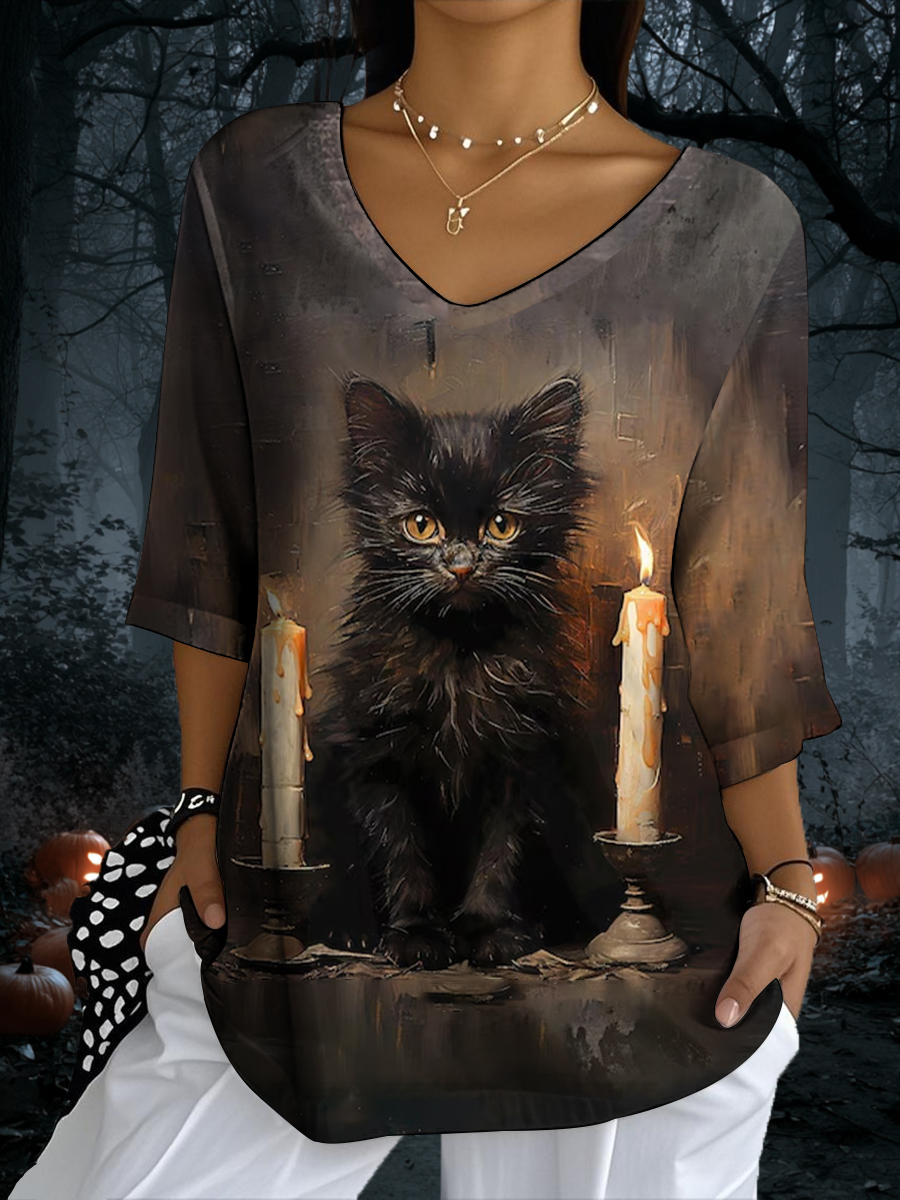 Damen Halloween Schwarze Katze Bedrucktes V-Ausschnitt Top