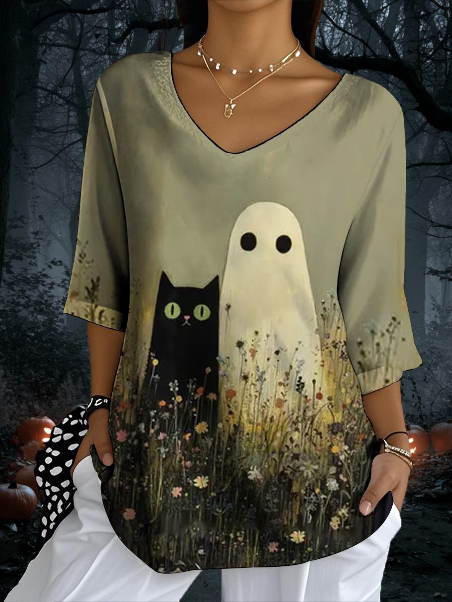Frauen Halloween schwarze Katze und Geist in Wildblumen bedrucktes V-Ausschnitt Top