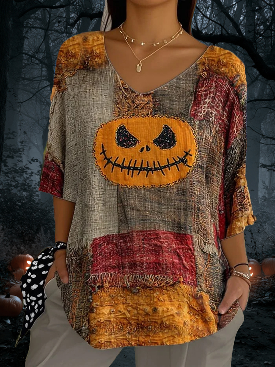 Damen Halloween Retro Kürbis Gesicht Print Top