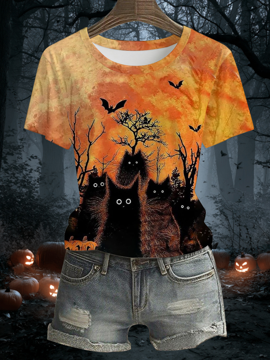 Damen-T-Shirt mit schwarzen Katzen bedrucktem Kurzarm