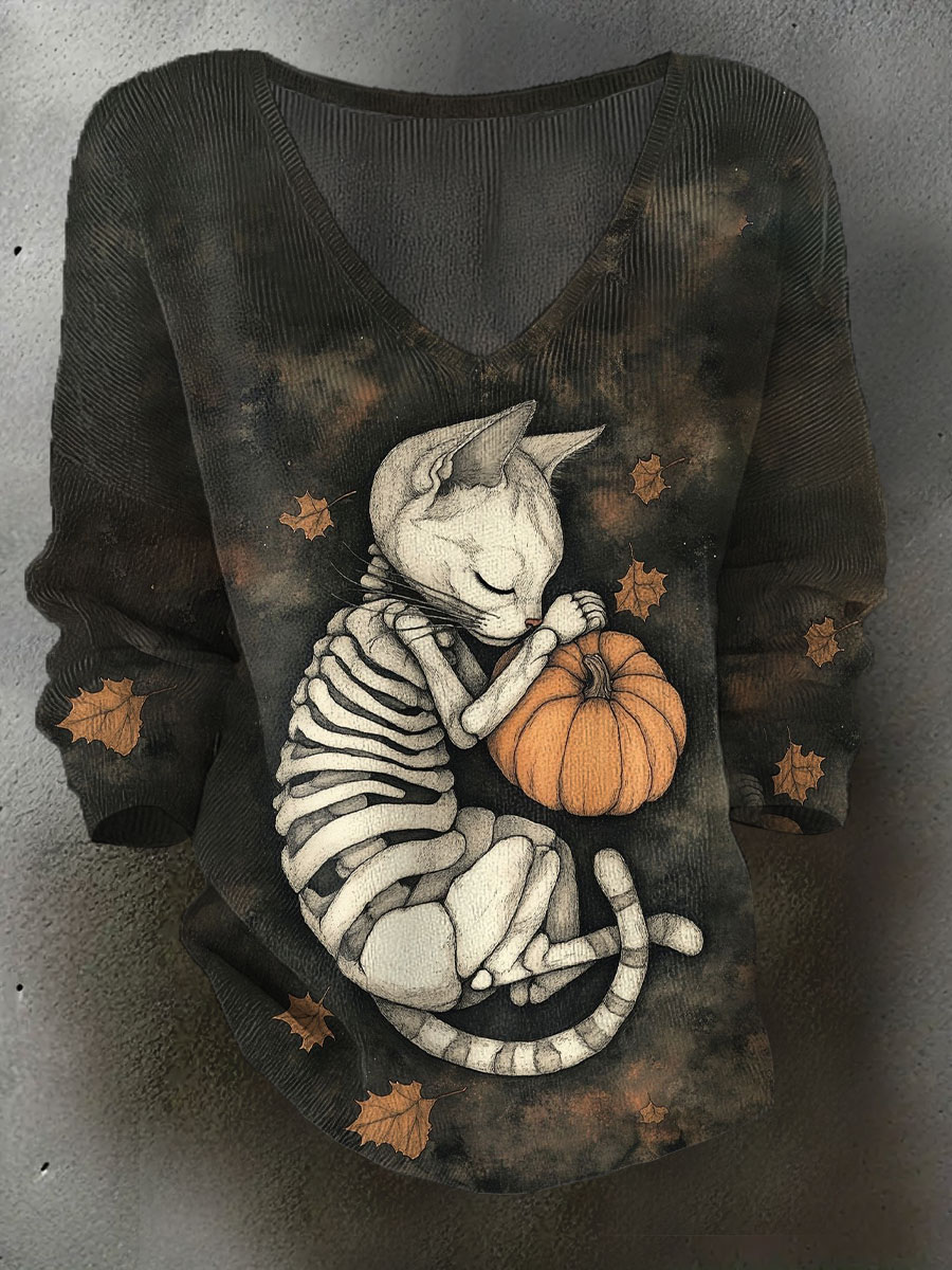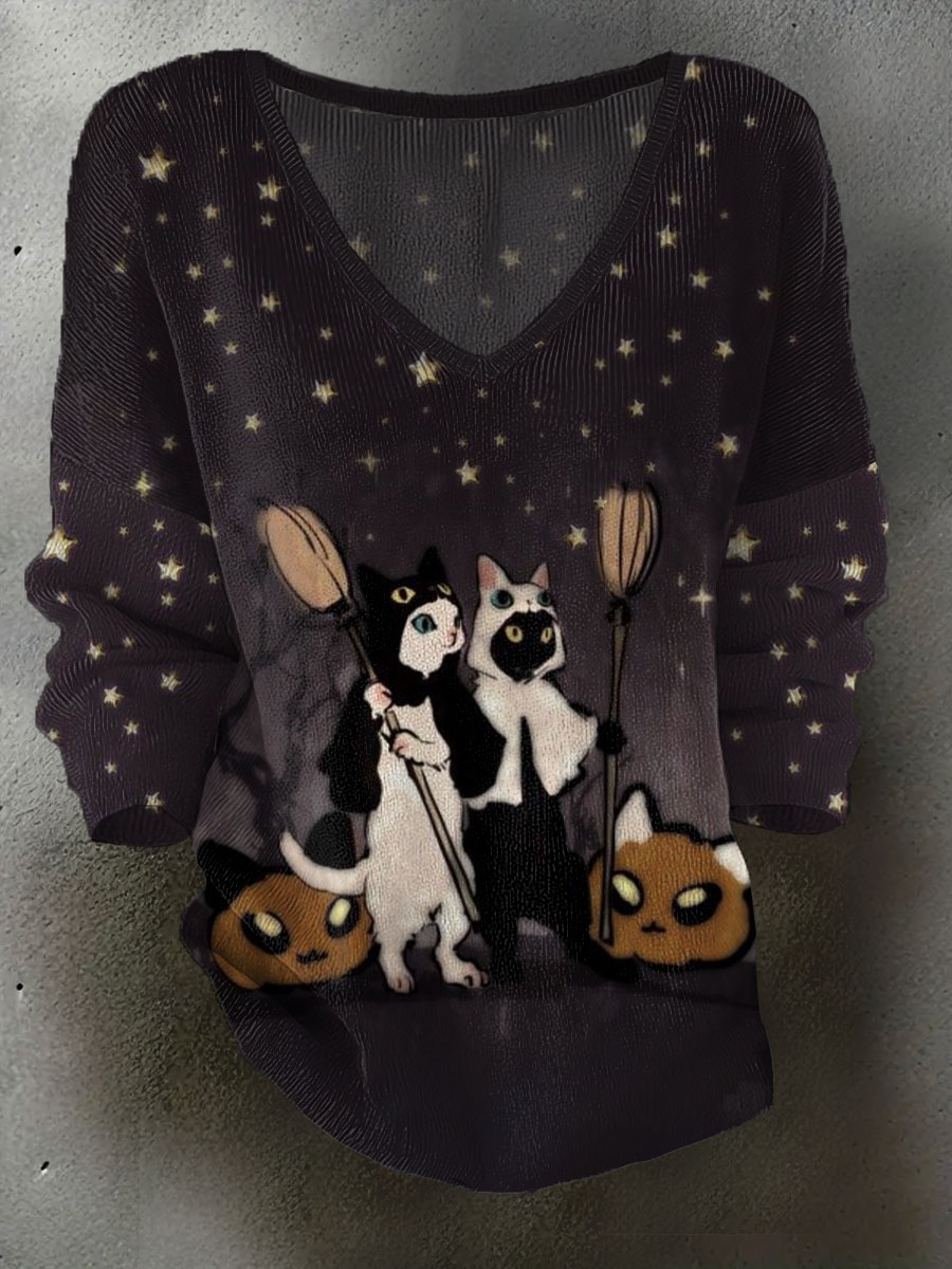 Frauen Halloween Geist schwarze Katze V-Ausschnitt T-Shirts