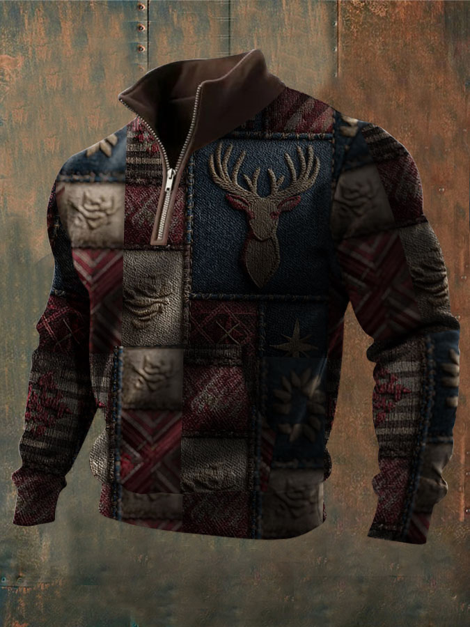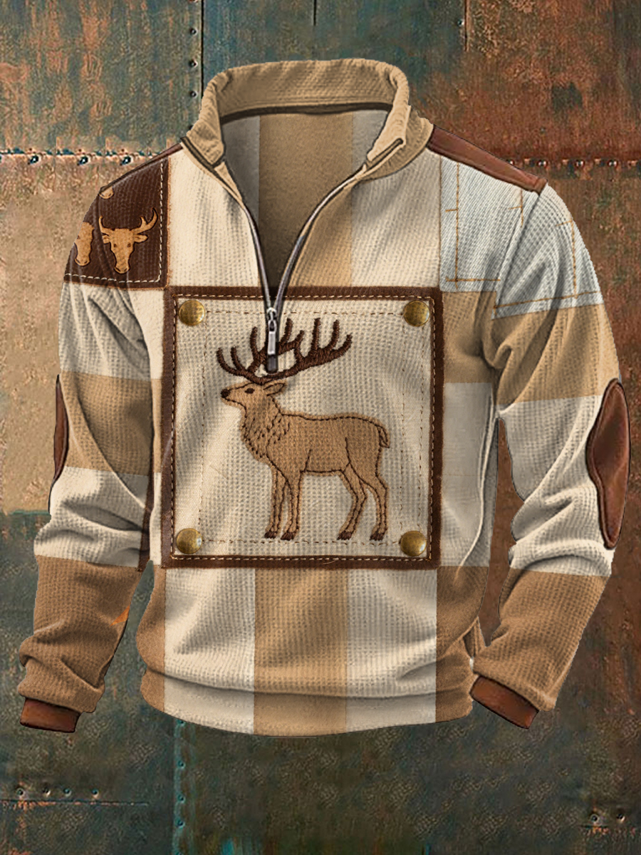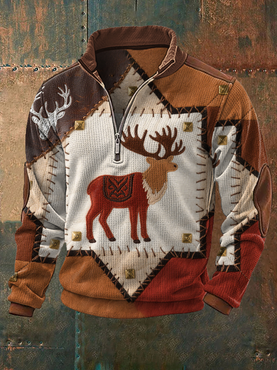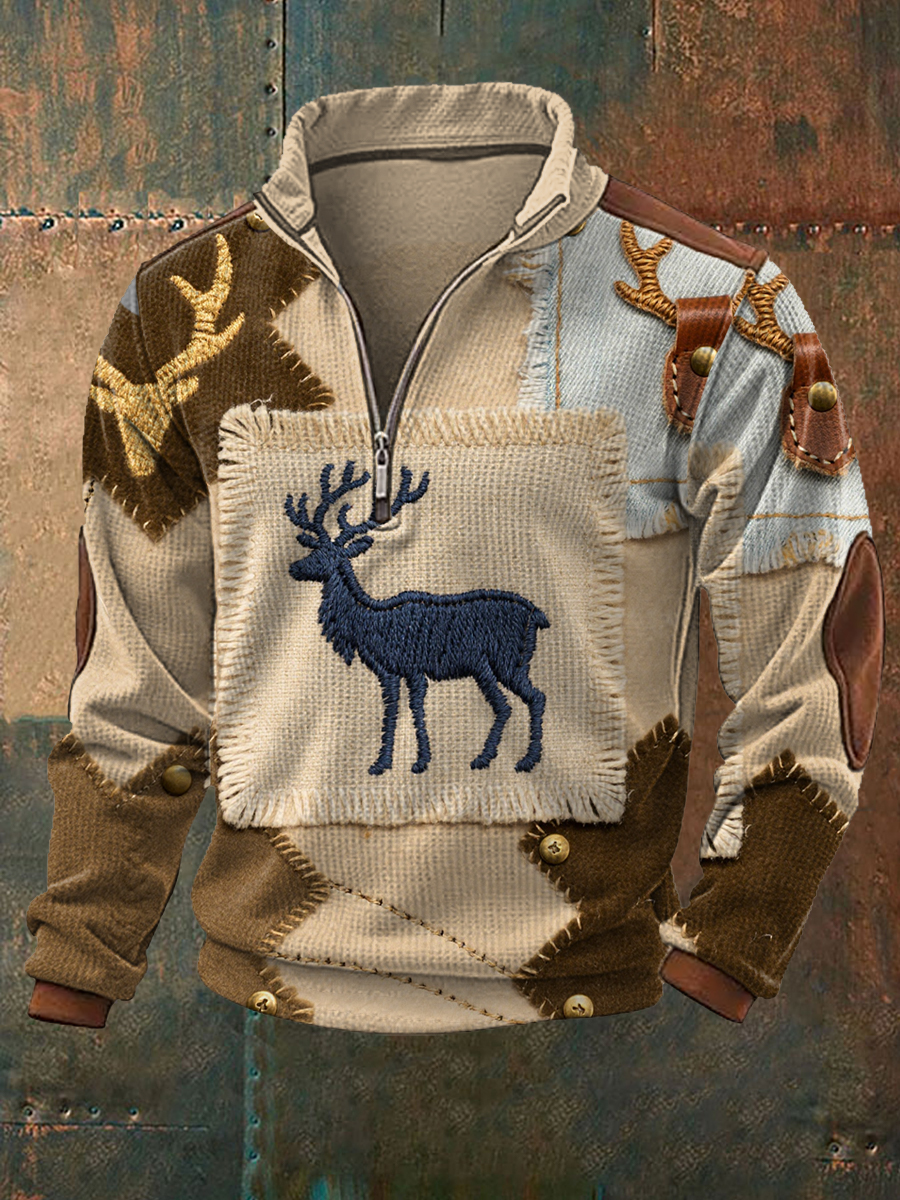 Herren Vintage Western Elch Patchwork Print Casual Waffel-Sweatshirt mit Reiß verschluss