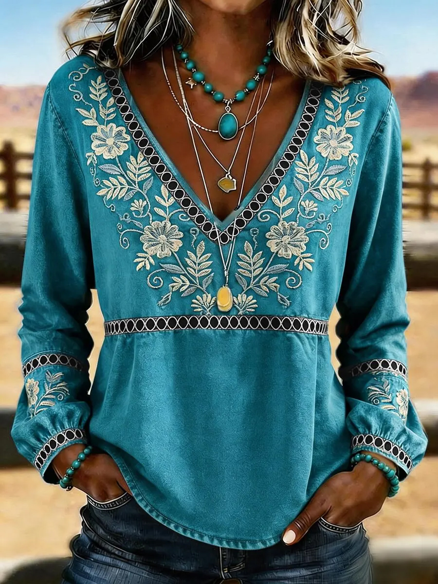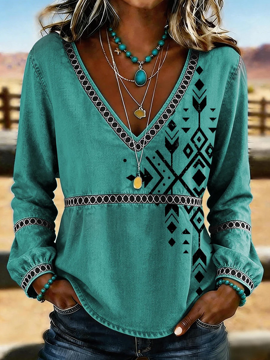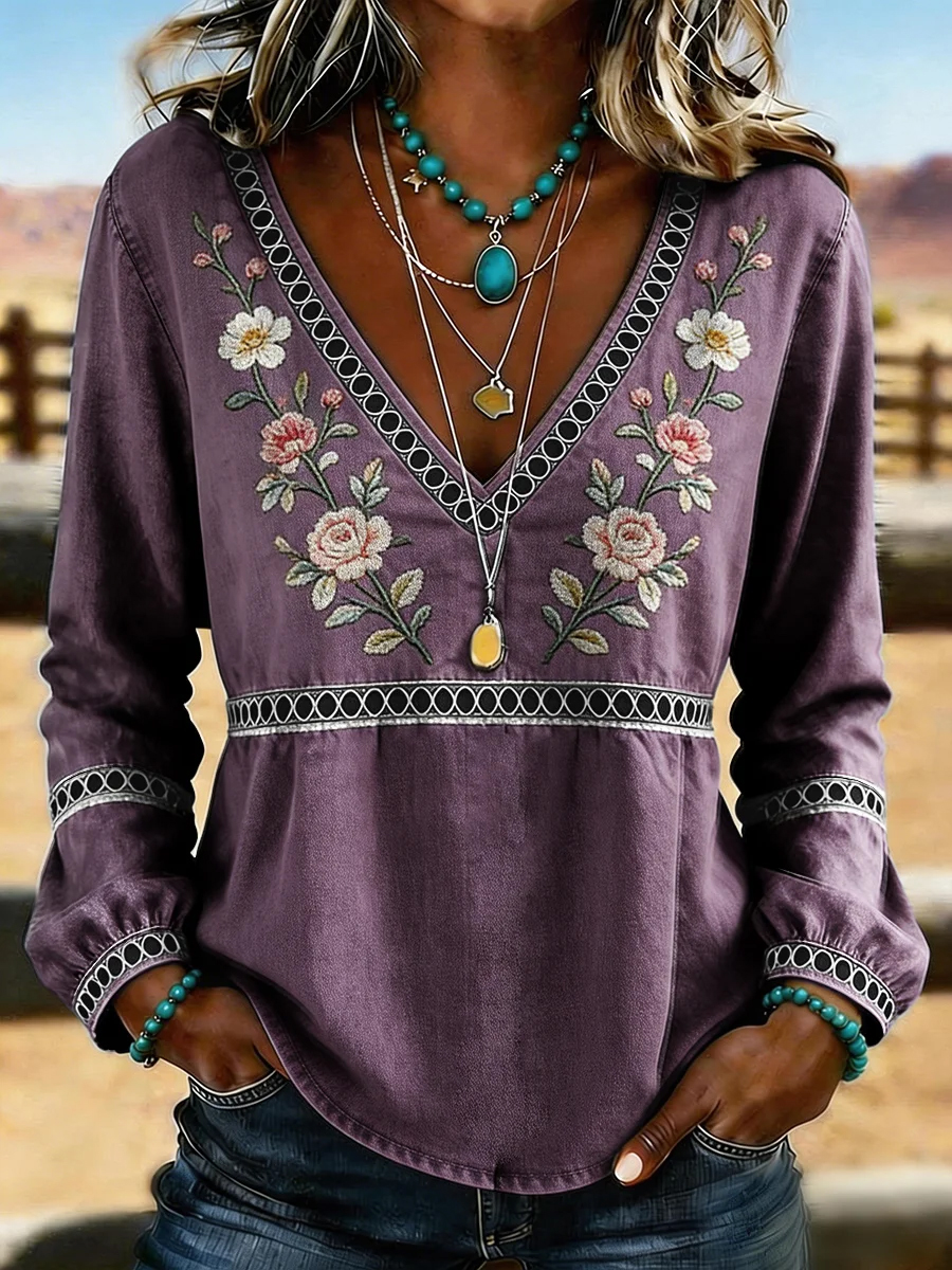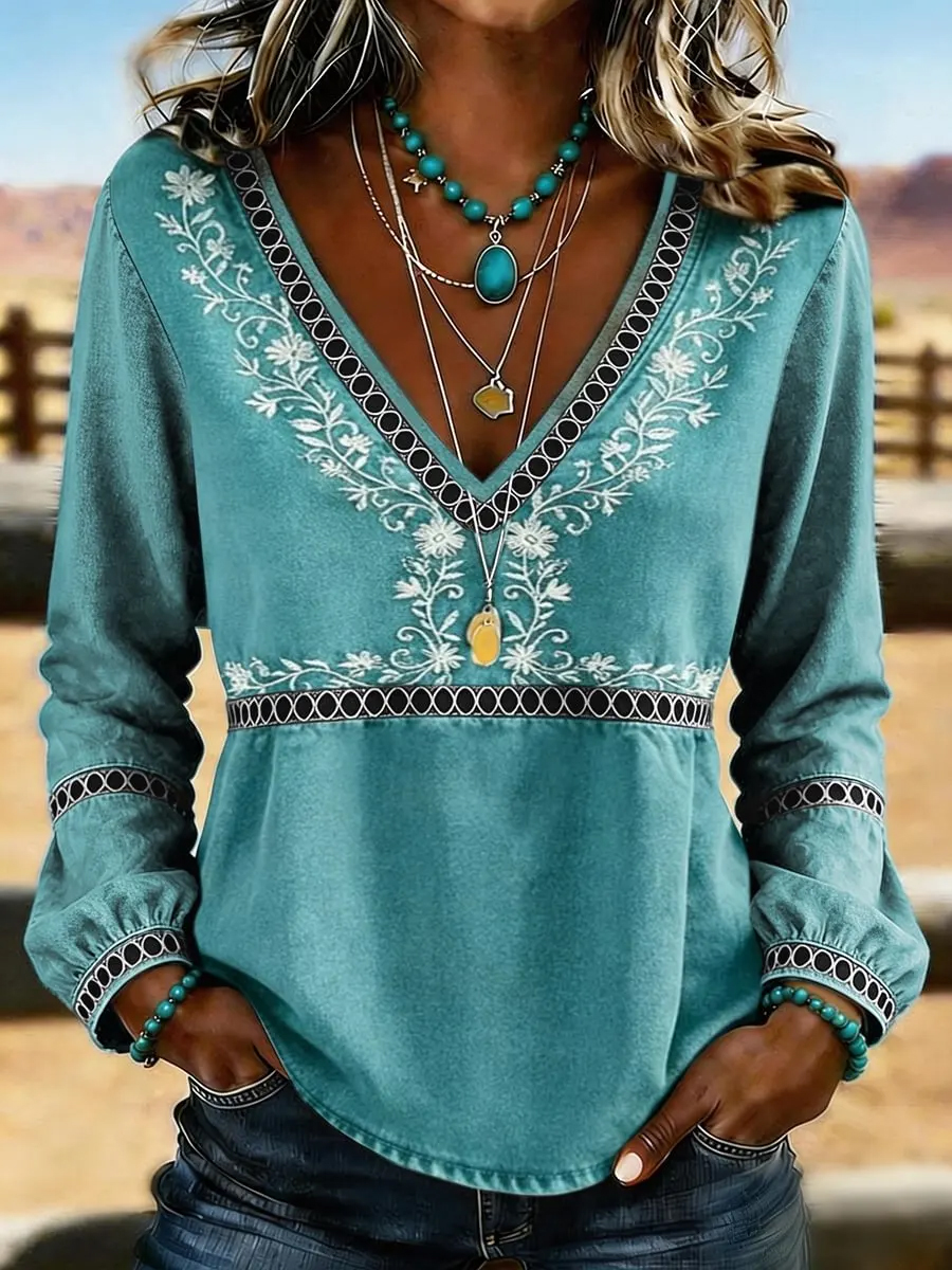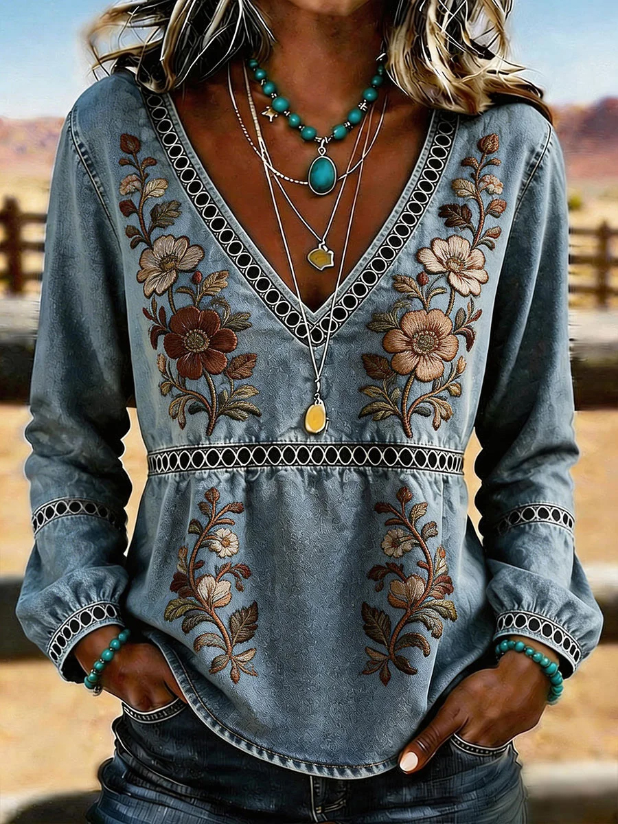 Damen-Oberteile im Western-Stil mit Blumenmuster und V-Ausschnitt
