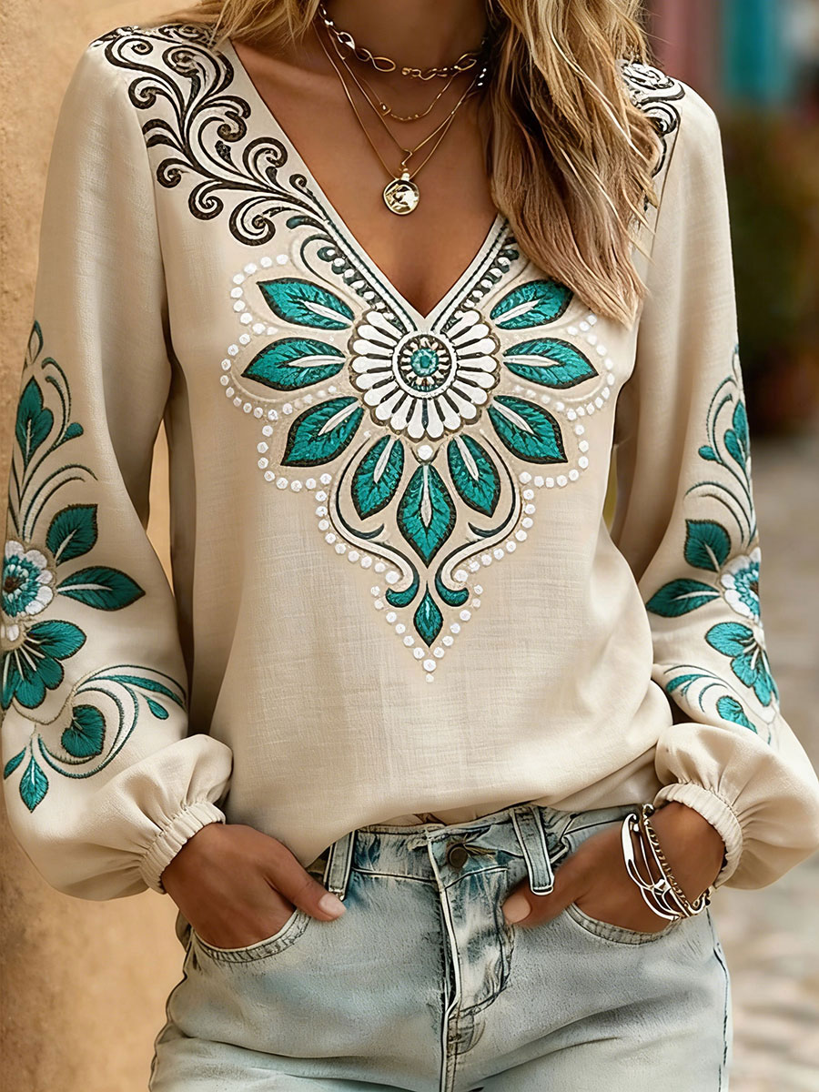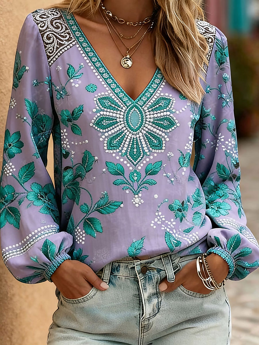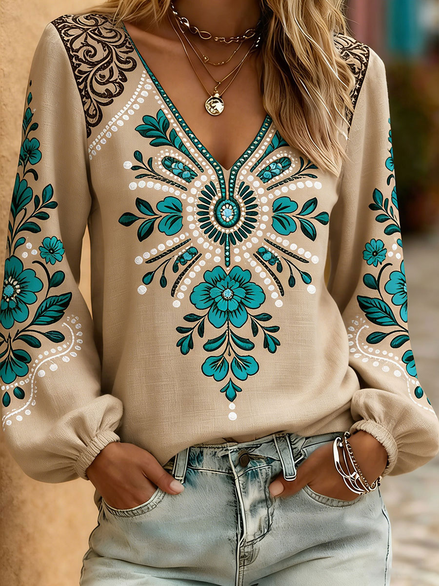 Damen-Tops im westlichen Stil mit Blumen druck mit V-Ausschnitt