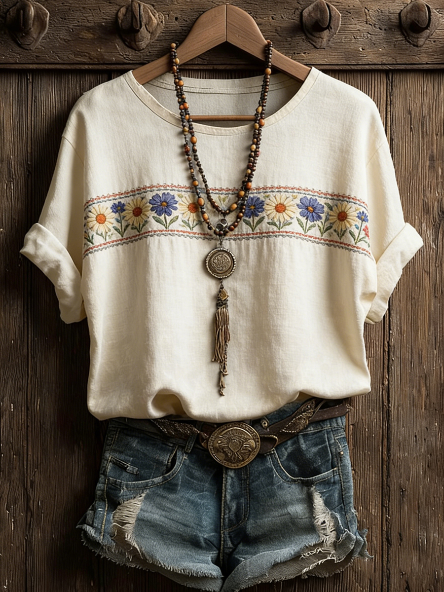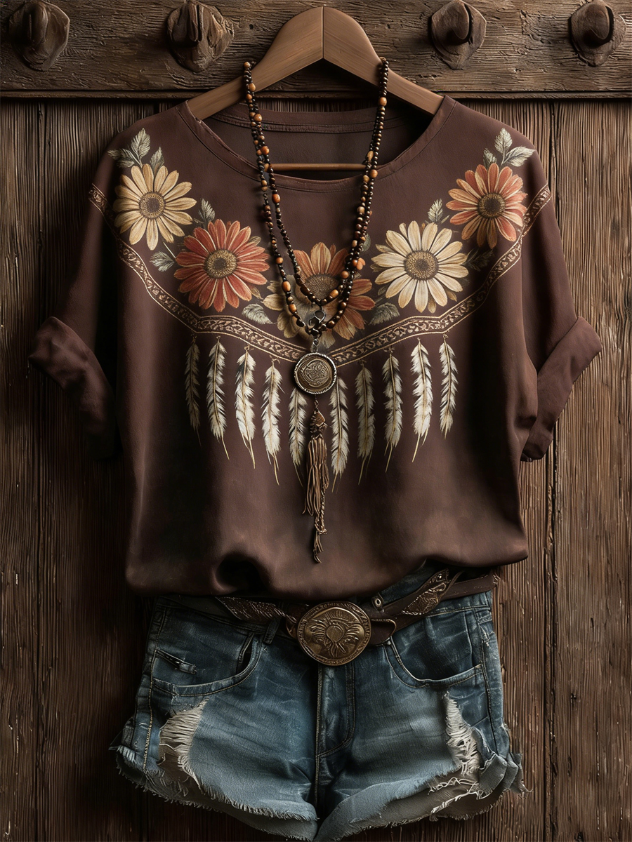 Damen-Vintage-Western-T-Shirt mit Pflanzen- und Blumenmuster