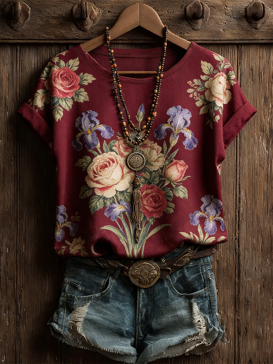 Damen Vintage Western Pflanzen Blumen Bedrucktes T-Shirt