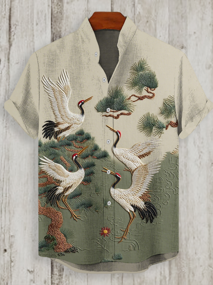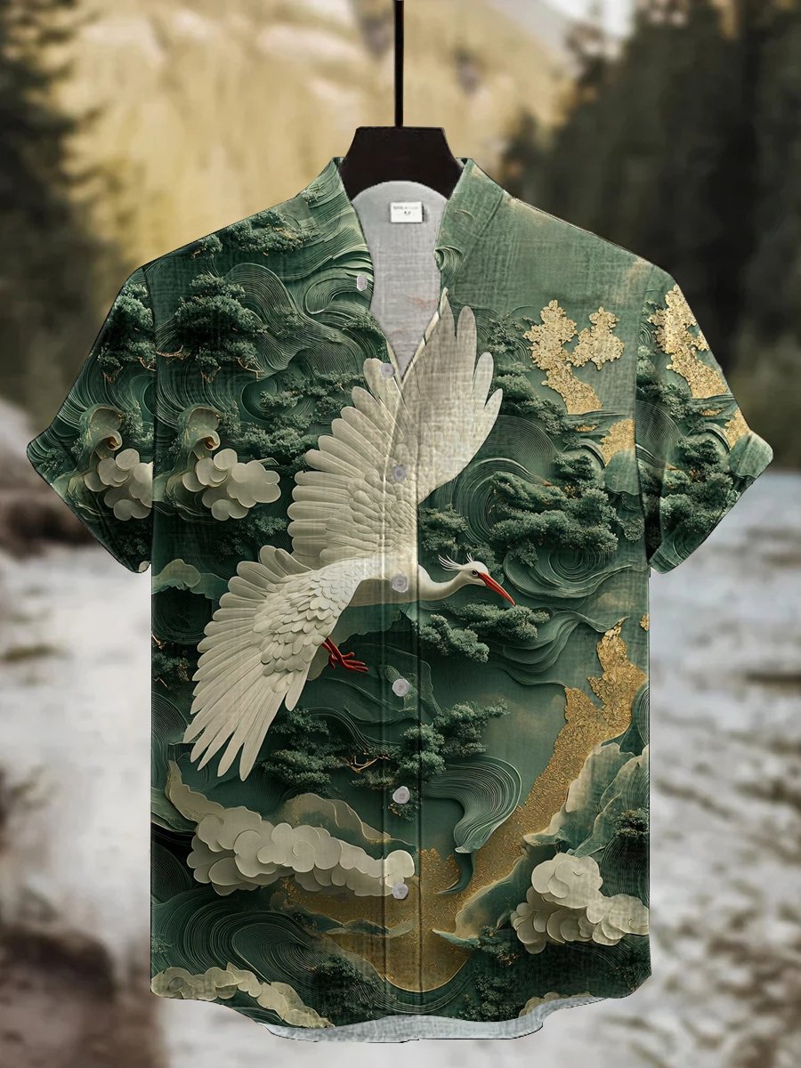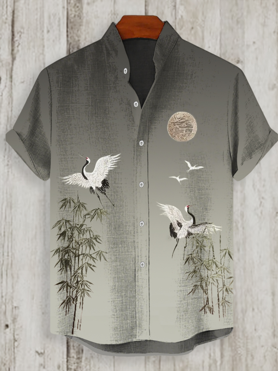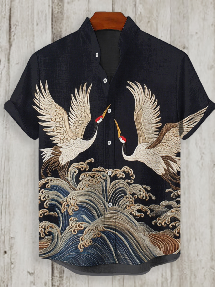 Japanisches Kran-Kunst-Hemd für Männer mit kurzen Ärmeln
