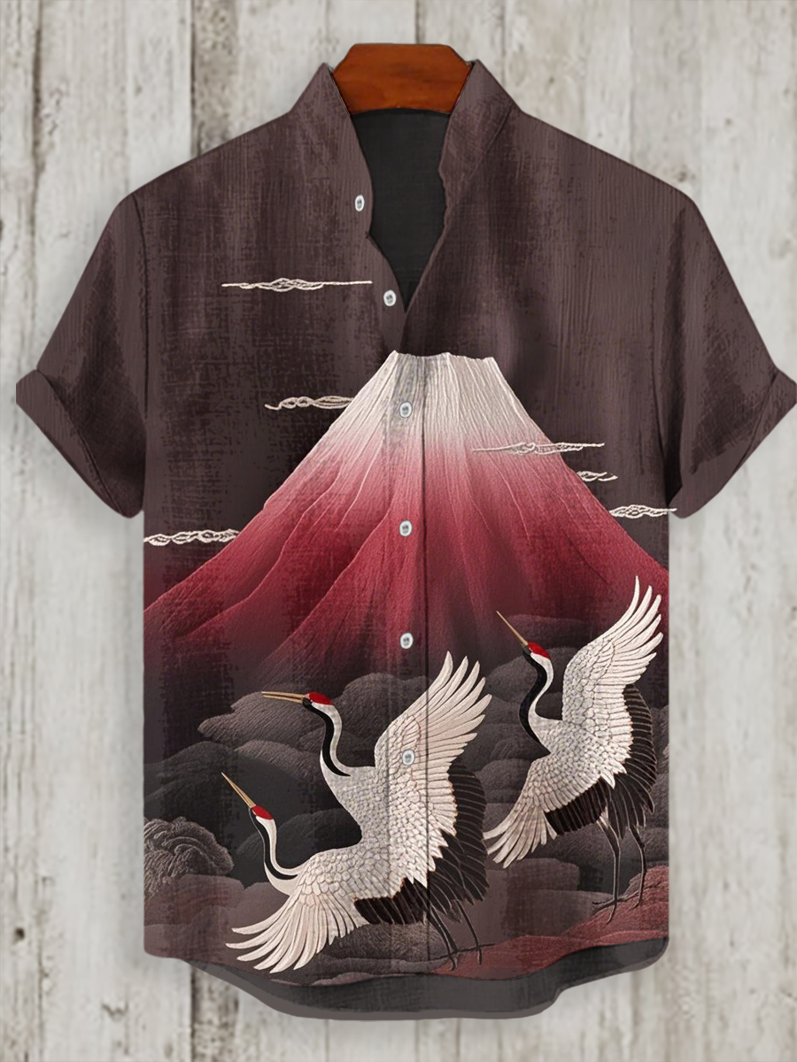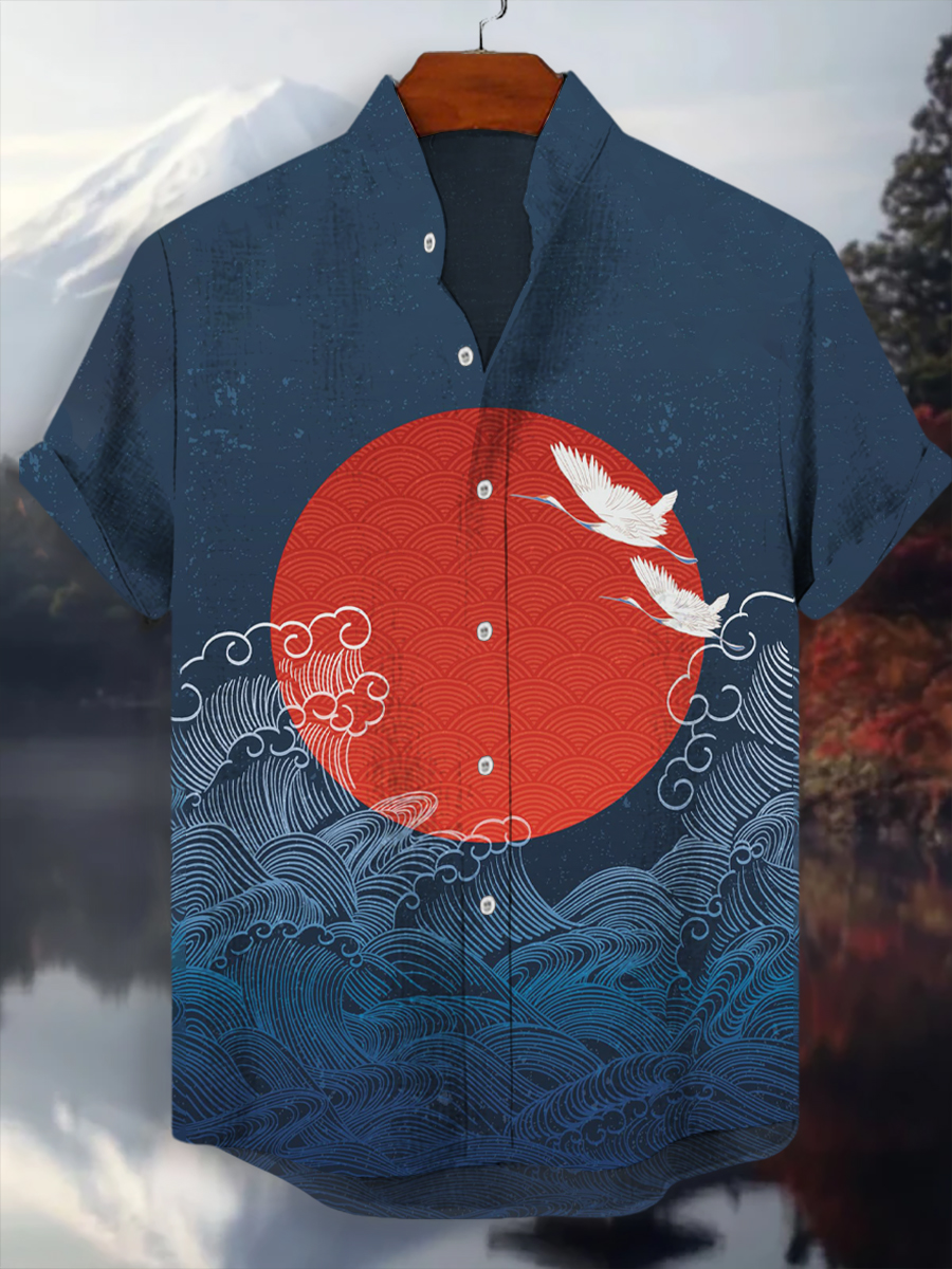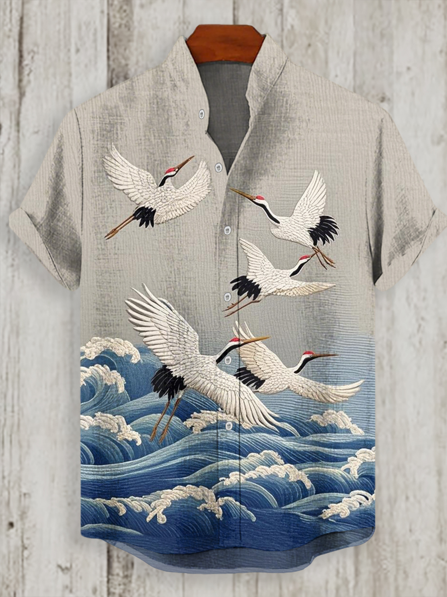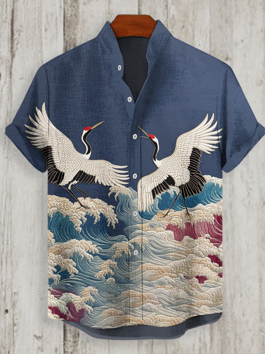 Japanisches Kran-Kunst-Hemd für Männer mit kurzen Ärmeln