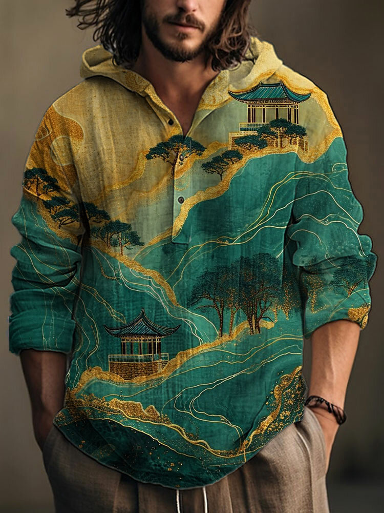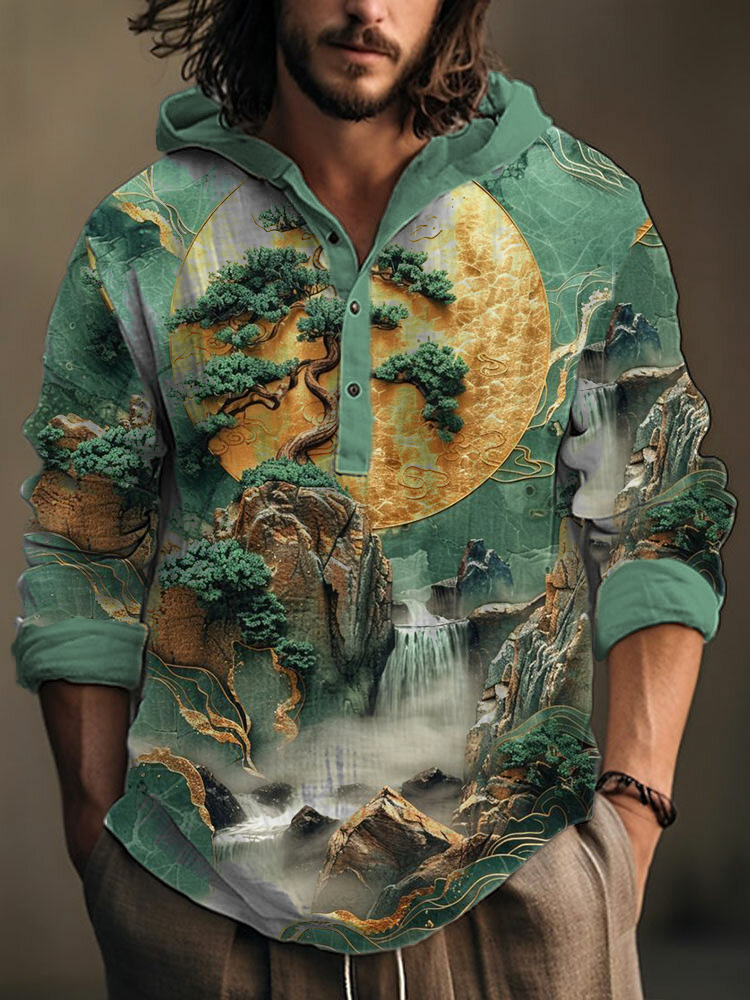 Herren Künstlerisches Landschafts druck Langarm Kapuzen oberteil