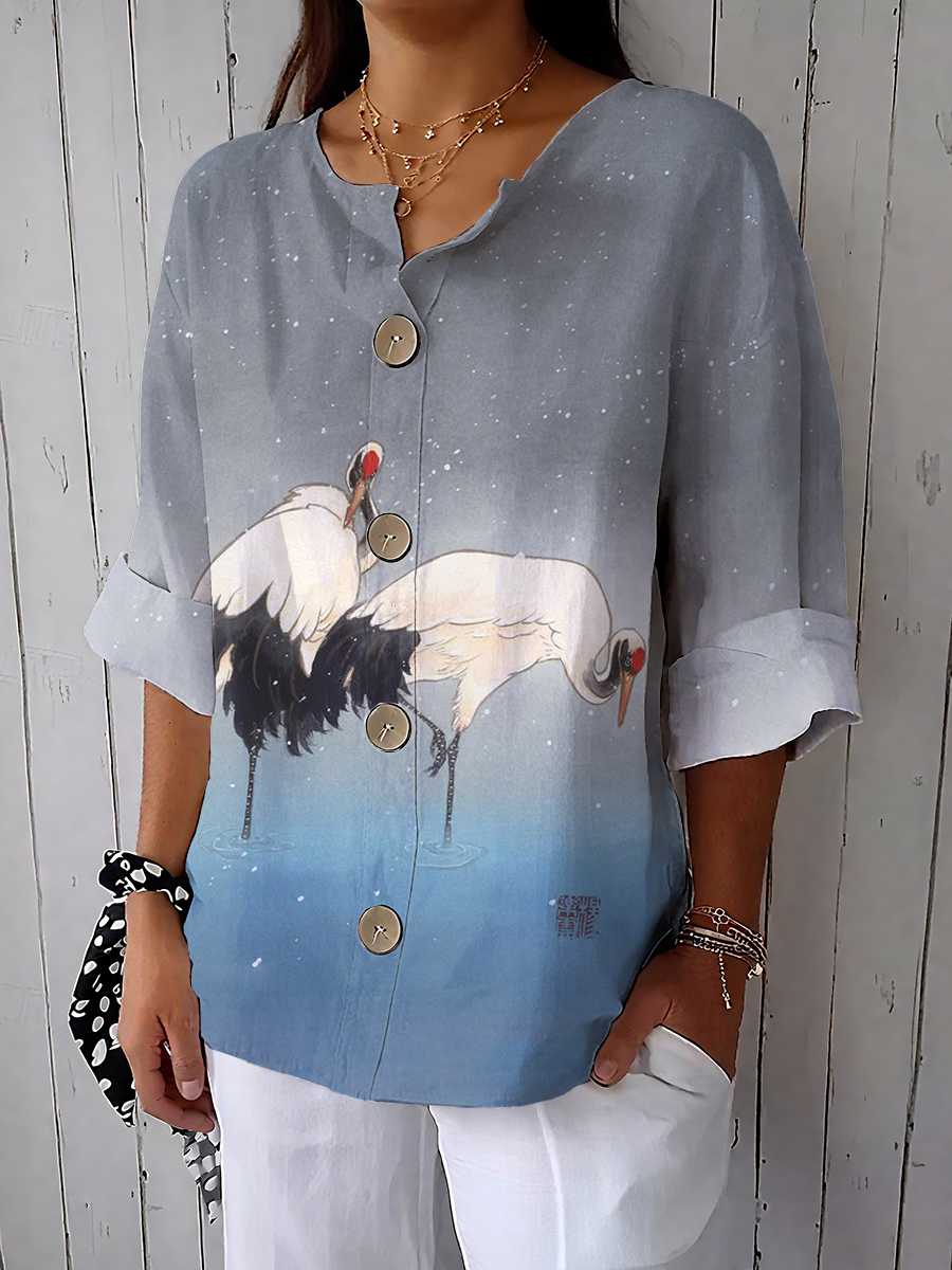 Damen Kran Kunstdruck Freizeit hemd aus Baumwolle und Leinen