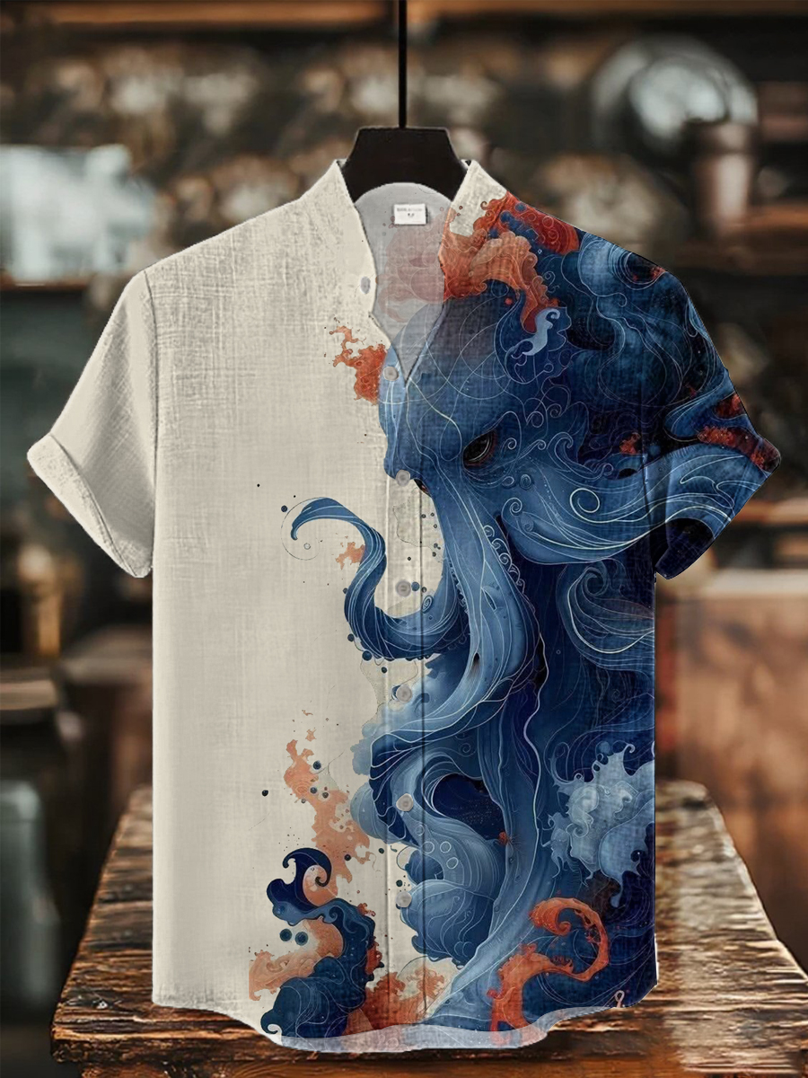 Herren-Leinen hemd mit japanischem Kunstwellen druck