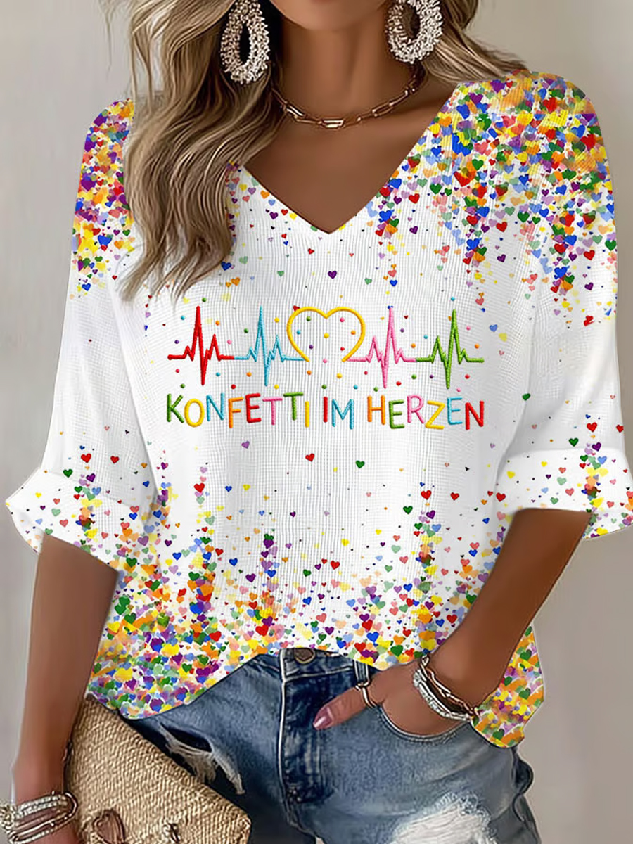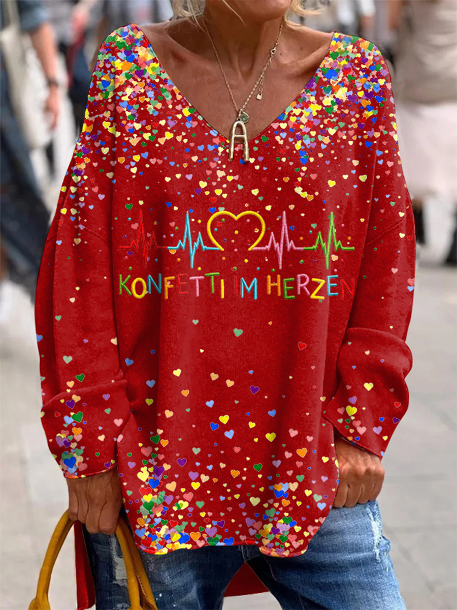 Damen Kölner Karneval Konfetti im Herzen Print lässiges V-Ausschnitt Langarm-Top
