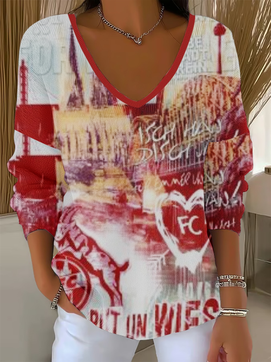 Frauen Köln Karneval Print lässig V-Ausschnitt lang ärmel iges T-Shirt