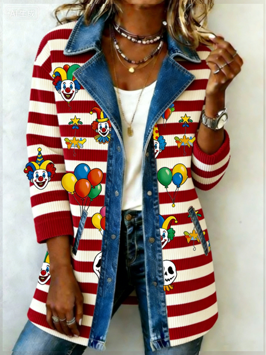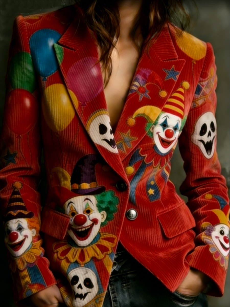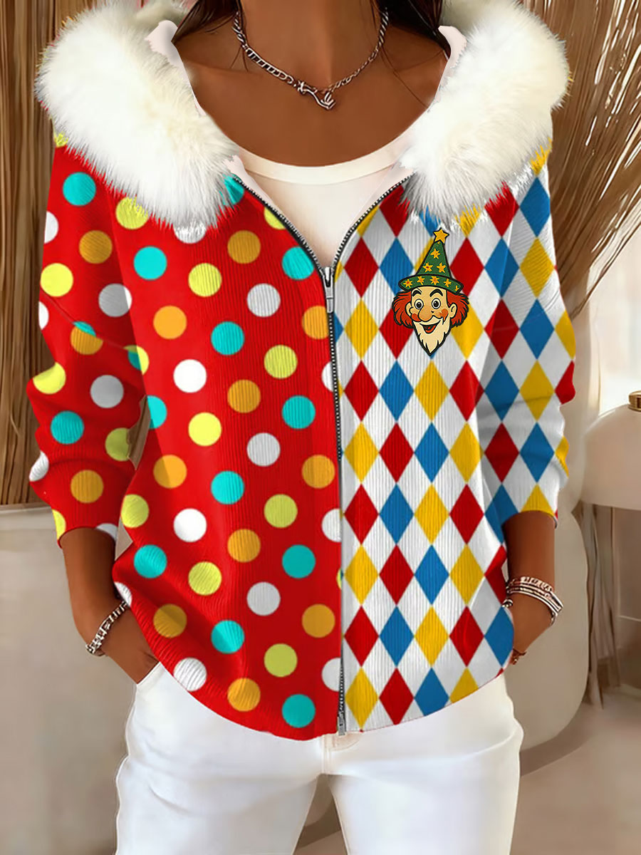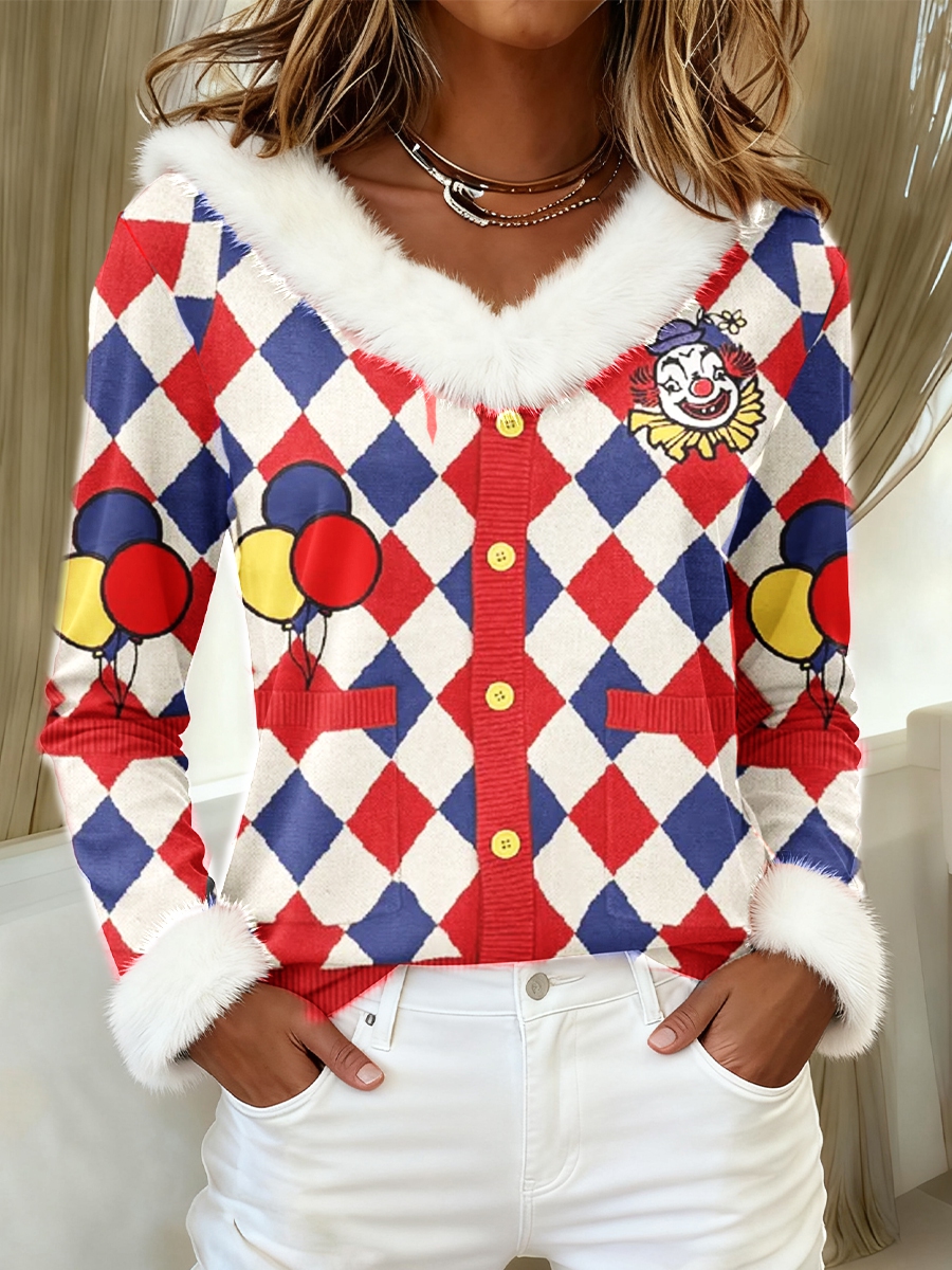 Frauen Köln Karneval Clown Faux Button 3D-Druck Pelzkragen Top
