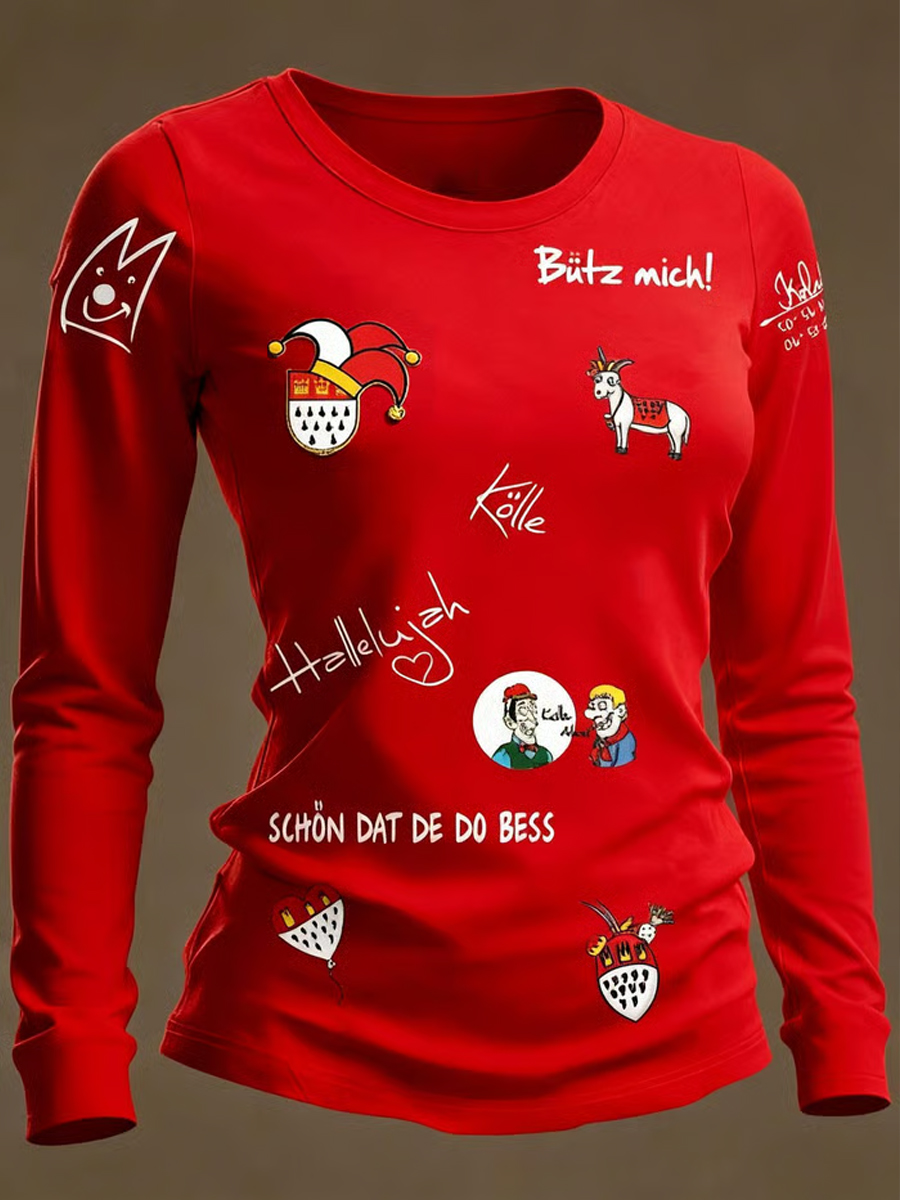 Damen-Kölner Karnevals druck Lässiges Langarm-Oberteil in mittlerer Länge