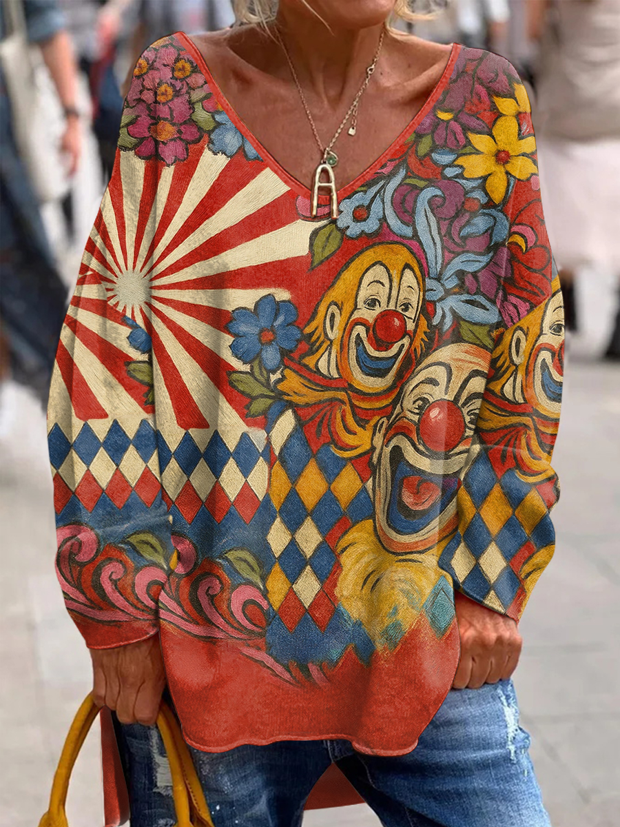 Frauen Köln Karneval Clown Print lässig V-Ausschnitt lang ärmel iges T-Shirt