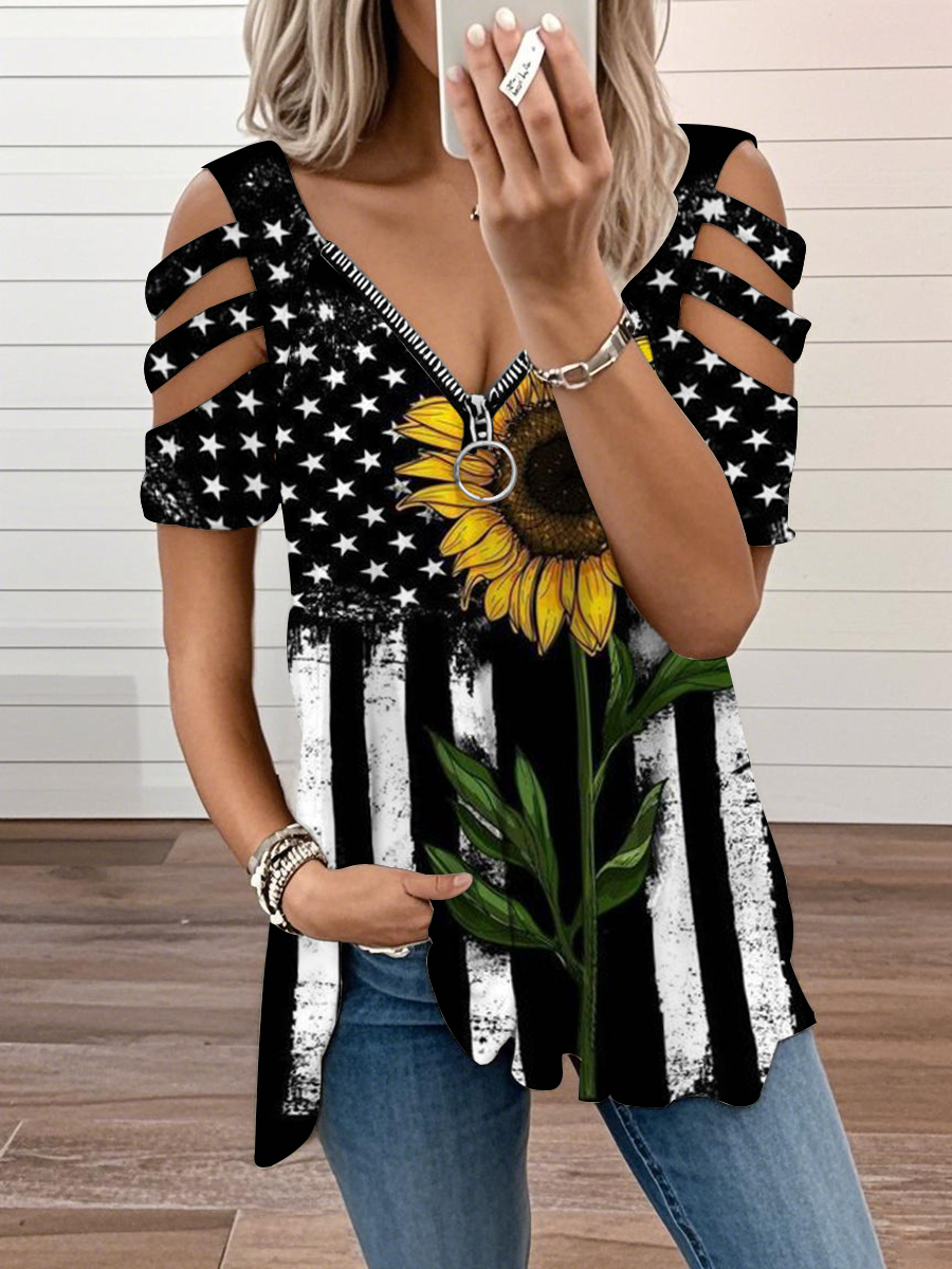 Frauen amerikanische Flagge Sonnenblume Print Casual T-Shirt