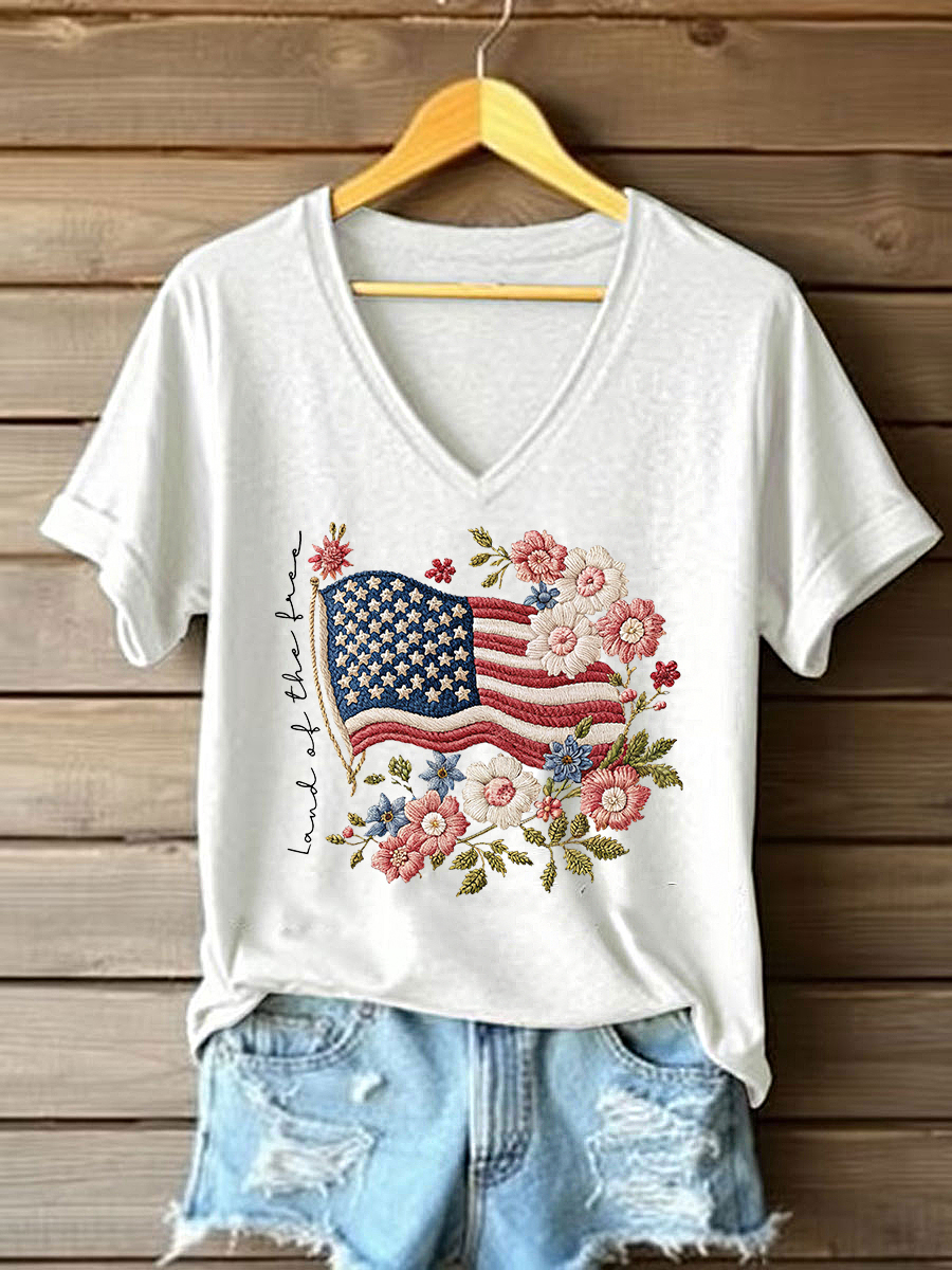 Frauen amerikanische Flagge bestickte Blumen druck lässig T-Shirt