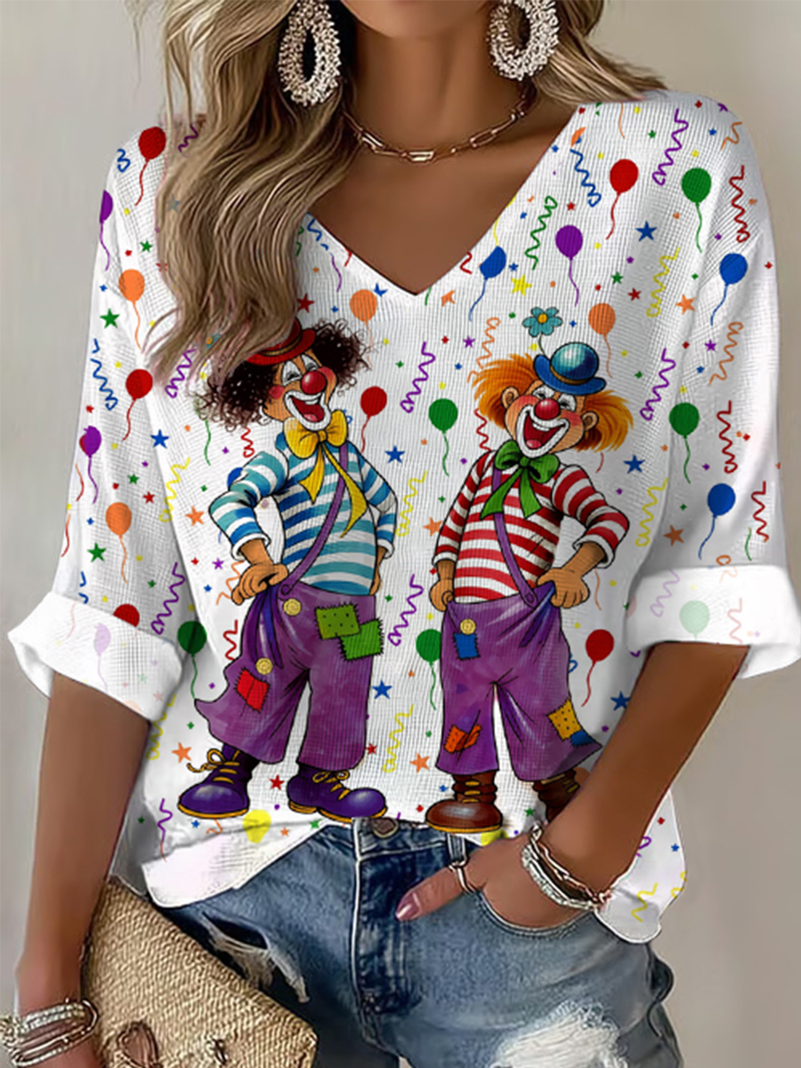Frauen Köln Karneval Clown Print Lässiges V-Ausschnitt Lang ärmel iges Top
