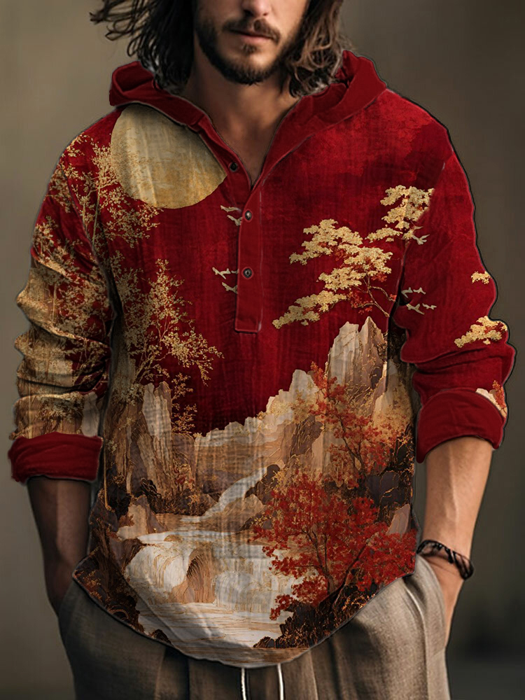 Herren Künstlerisches Landschafts druck Langarm Kapuzen oberteil