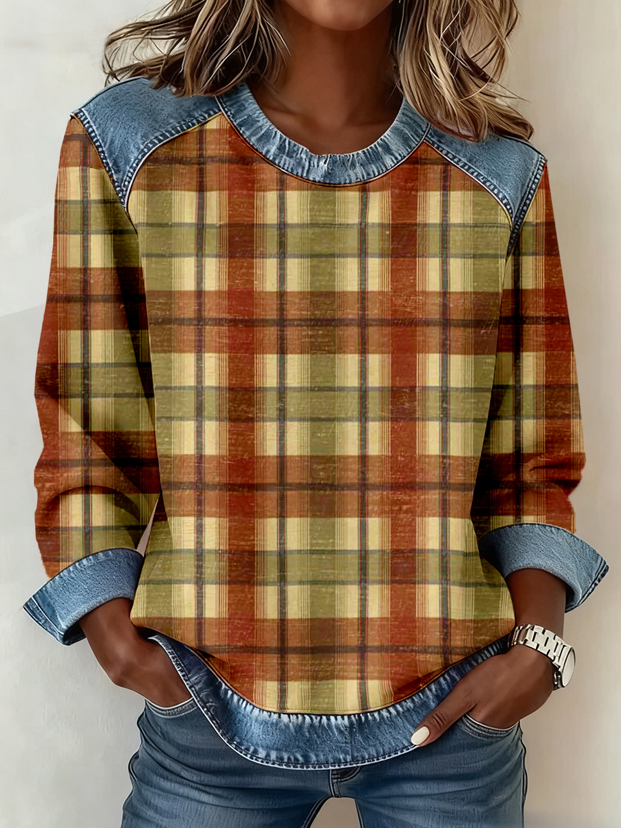 Damen Vintage Kariertes Muster Denim Patchwork Sweatshirt