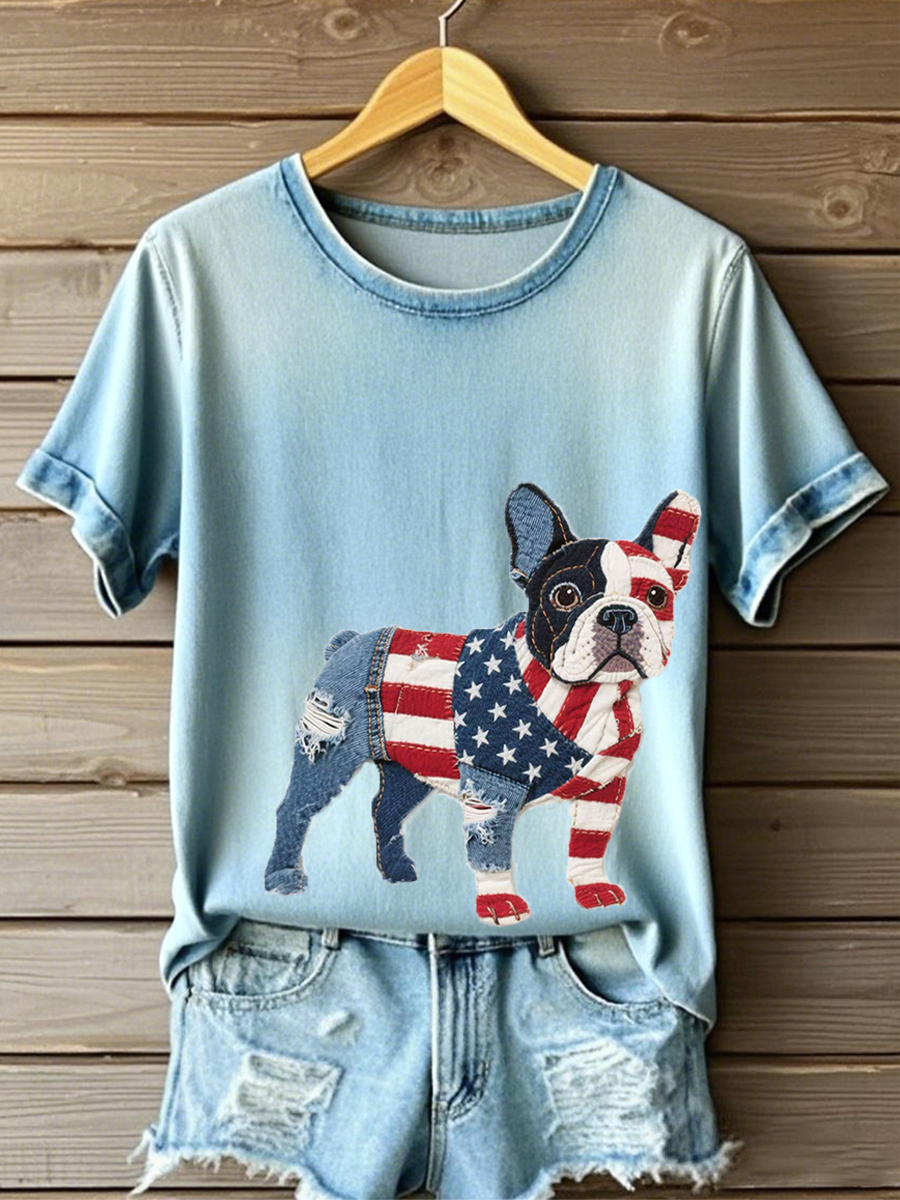 Frauen Unabhängigkeit stag inspirierte französische Bulldogge Muster Patchwork Kunst T-Shirt