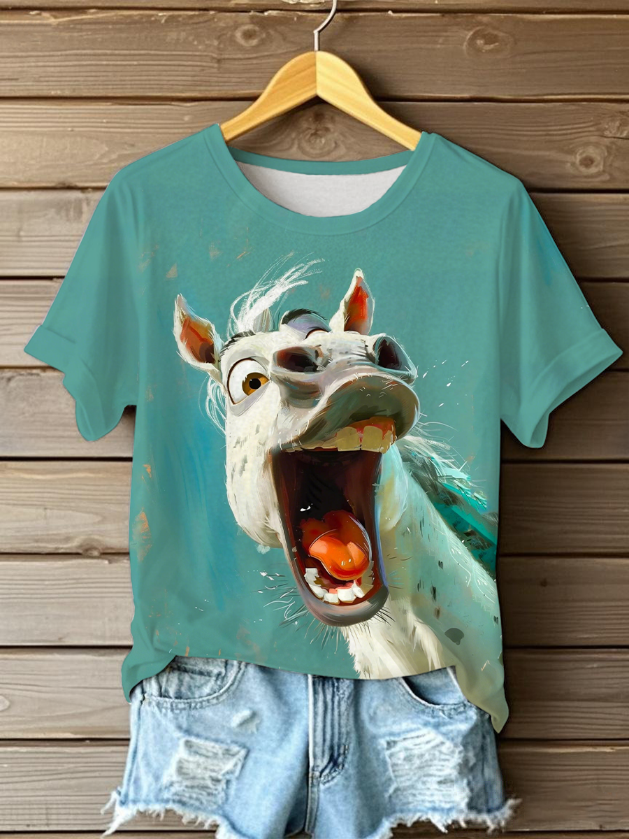 Frauen Lustiges verrücktes Haar Cartoon Esel Print Casual T-Shirt