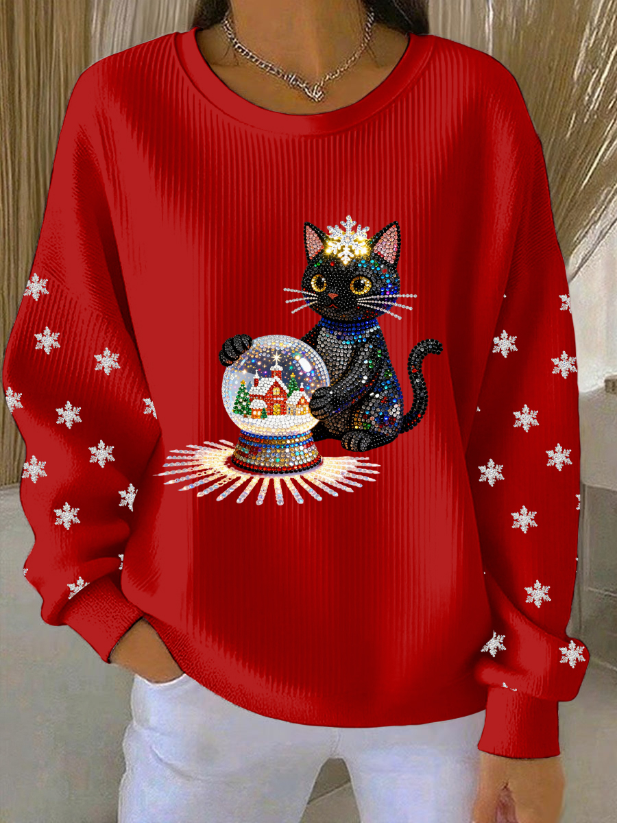 Damen Sweatshirt mit Rundhals ausschnitt, schwarzer Katzen druck