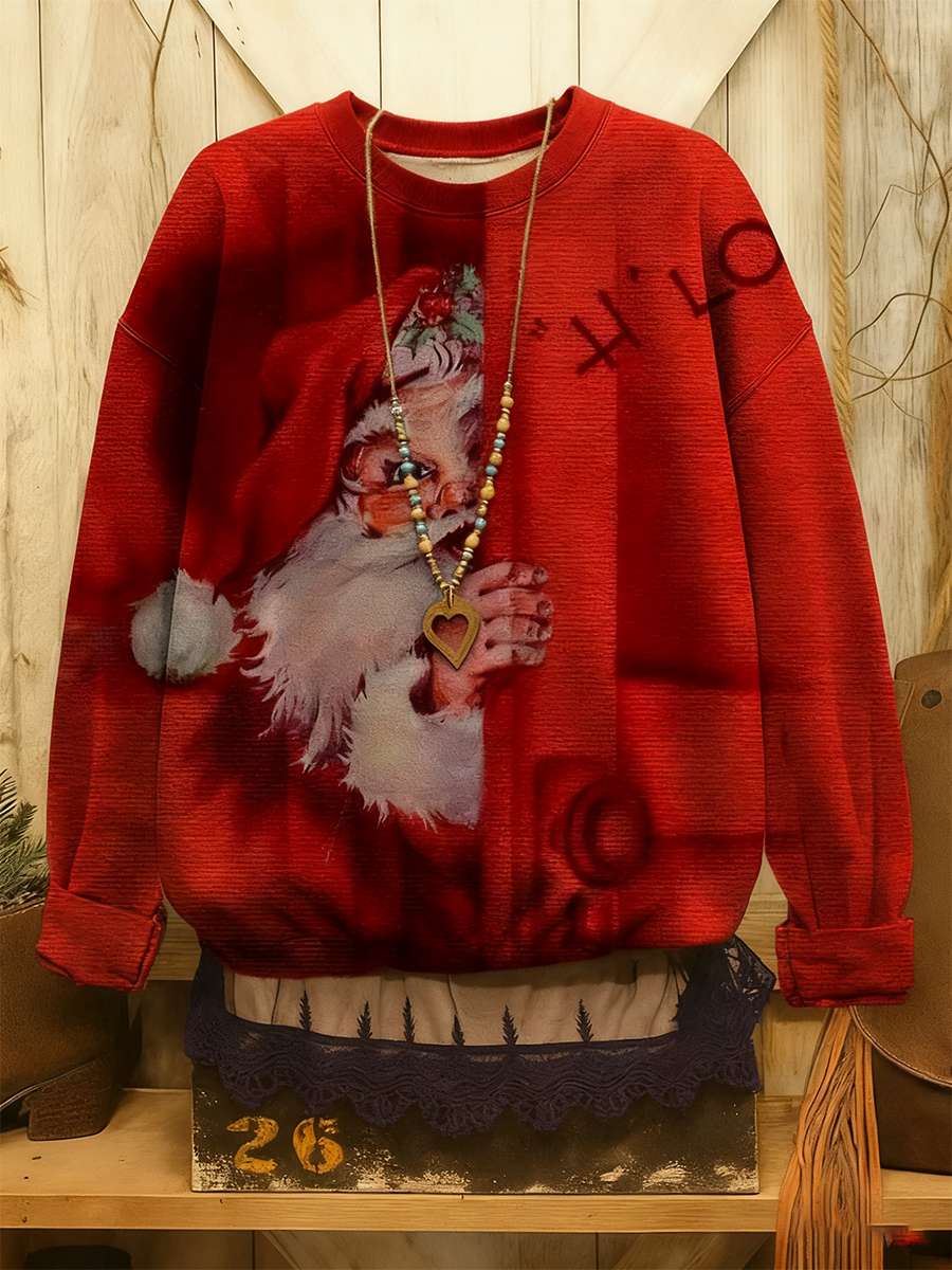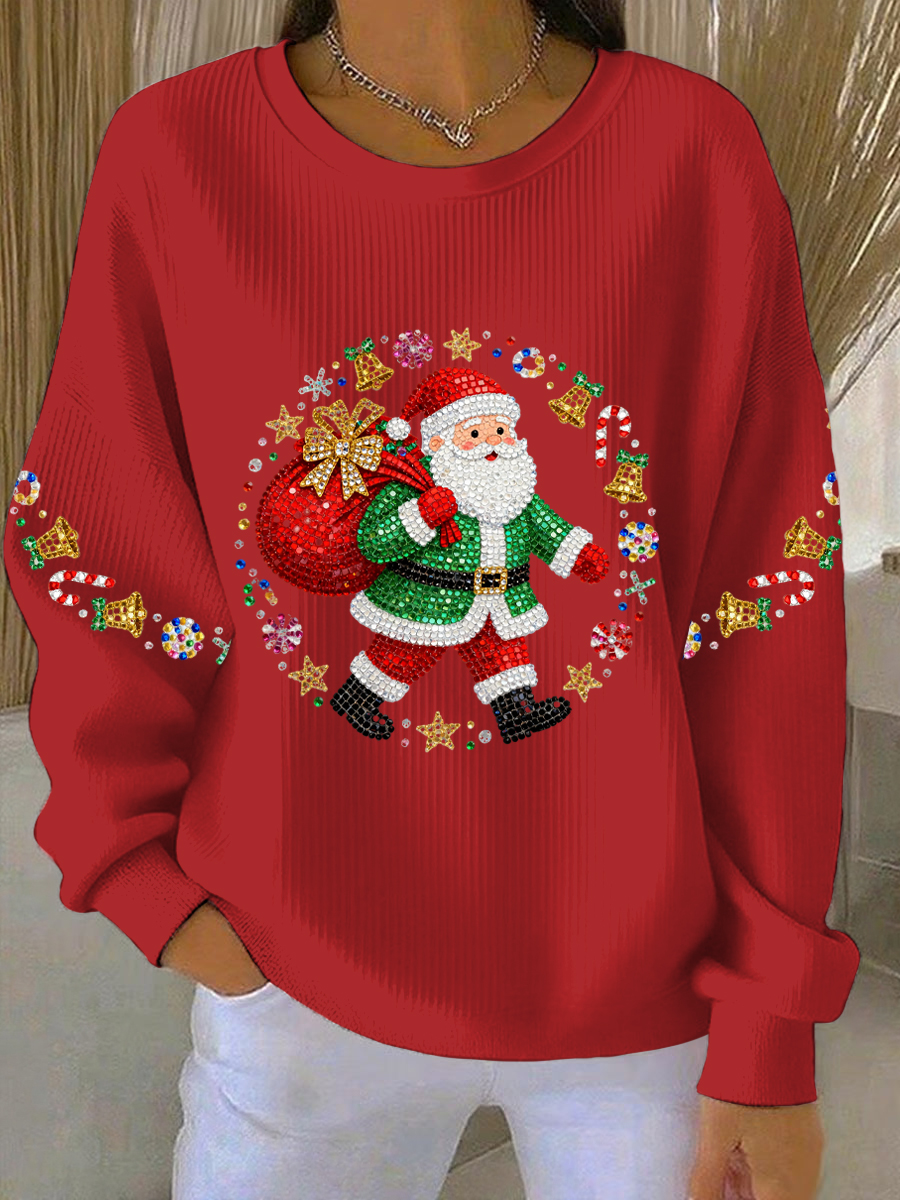 Damen Weihnachtsmann-Druck Geripptes Rundhals-Sweatshirt