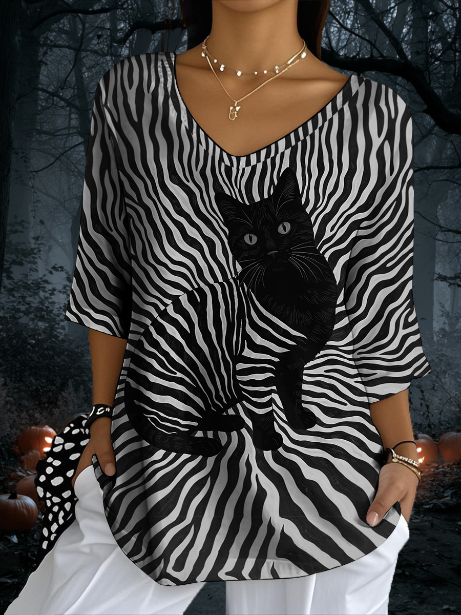 Damen schwarze Katzen streifen bedrucken lässiges Halb ärmel oberteil