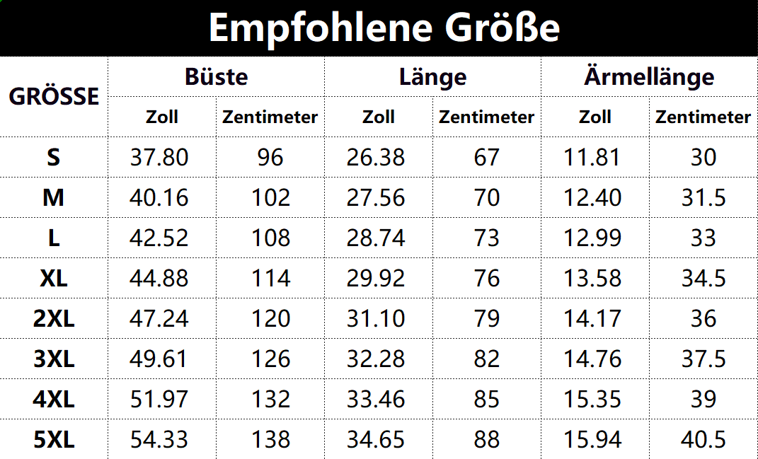 • Vorschlag: *Diese Daten wurden aus der manuellen Messung des Produkts erhalten, es kann um 0,03-0,06 ZOLL/1-3 CM aus geschaltet sein