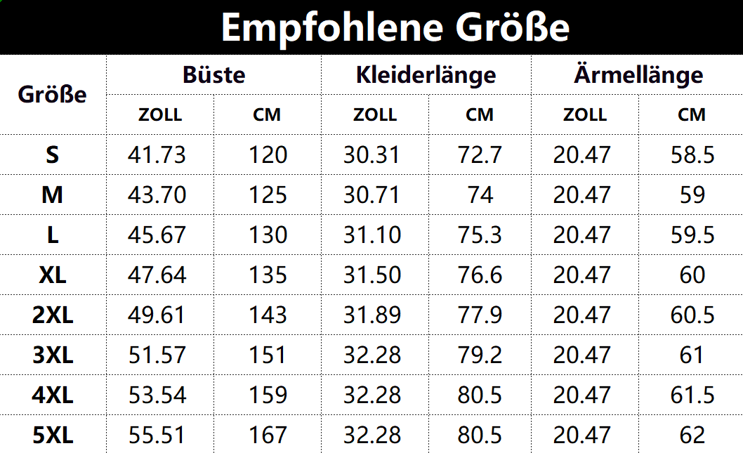 • Vorschlag:* Diese Daten wurden aus der manuellen Messung des Produkts erhalten, es kann um 0,03-0,06 ZOLL/1-3 CM aus geschaltet sein