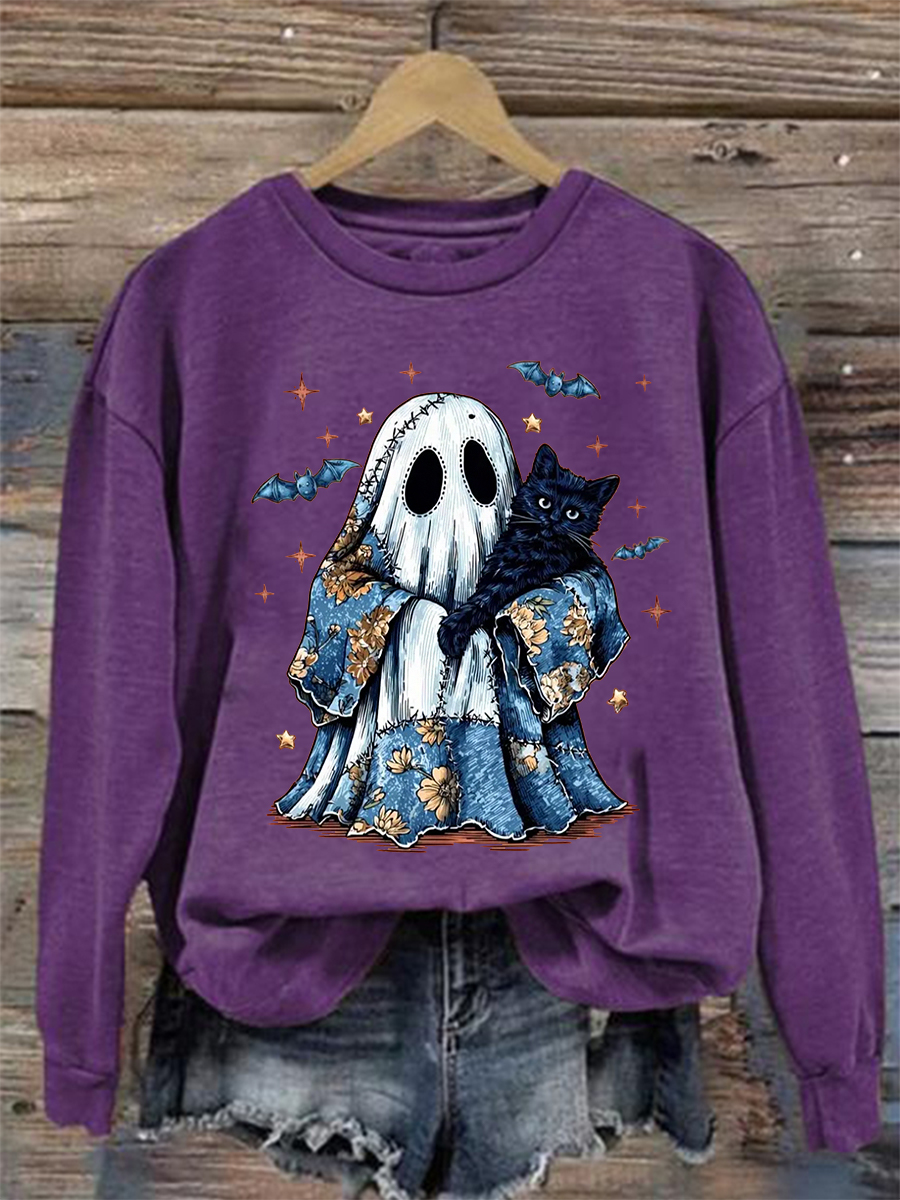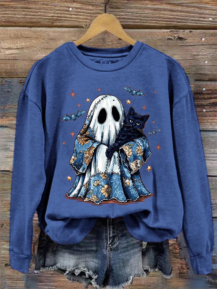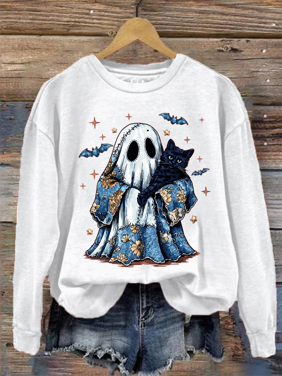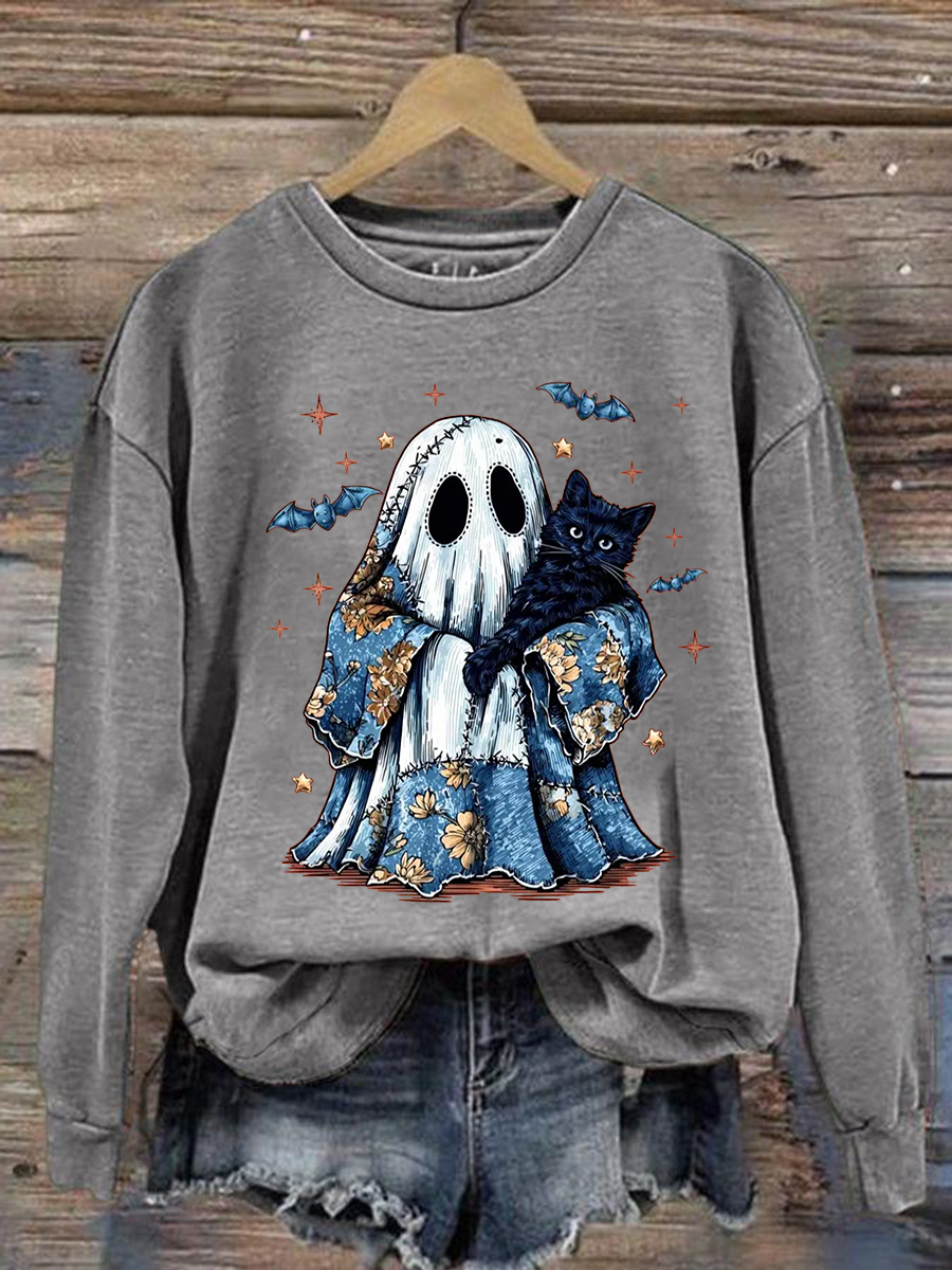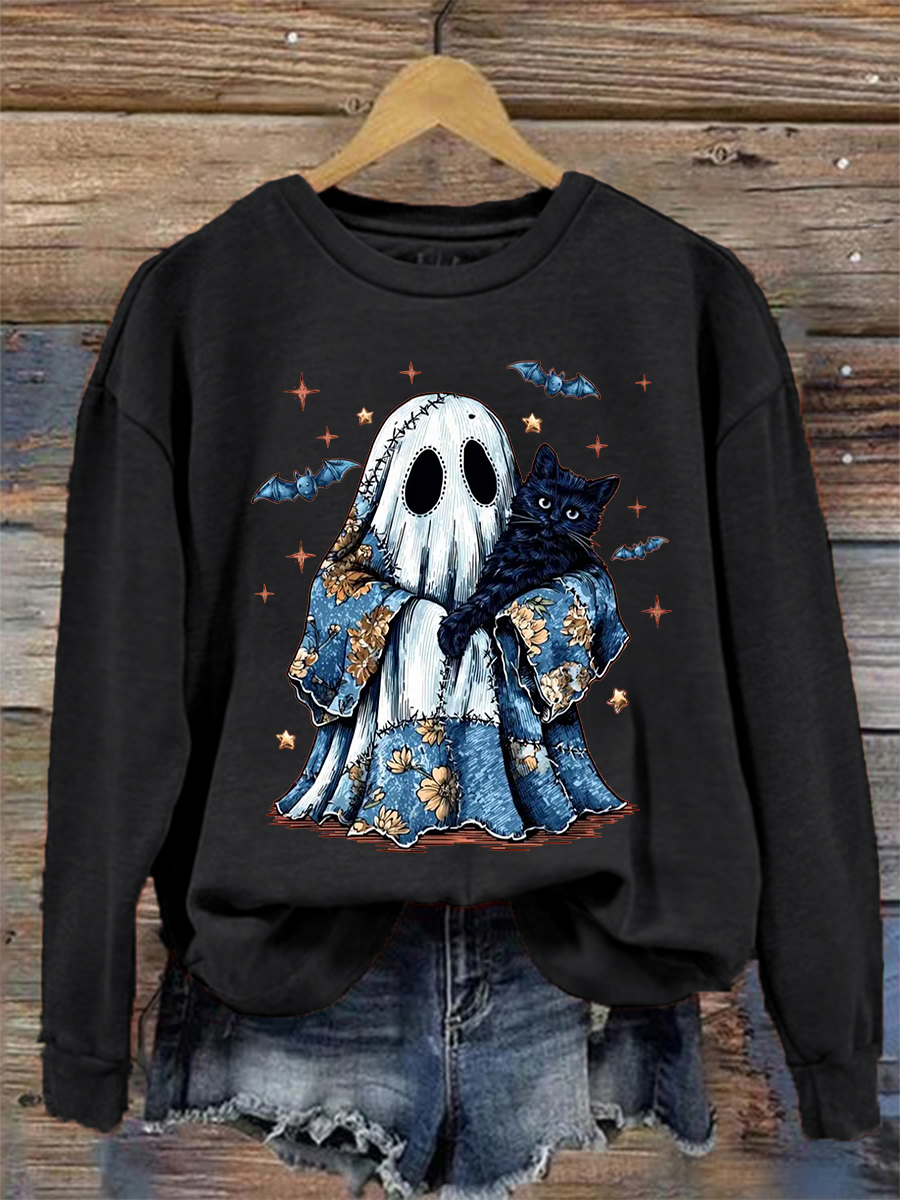 Damen niedliches Halloween-Geist-schwarzes Katzen-Print-Sweatshirt