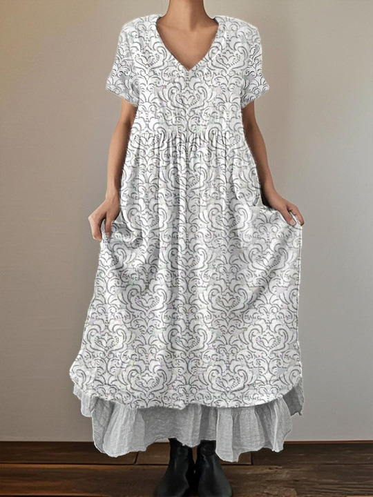 Damen Retro hohles stereo skopisch bedrucktes Kurzarm-Doppelschicht-Kleid mit V-Ausschnitt