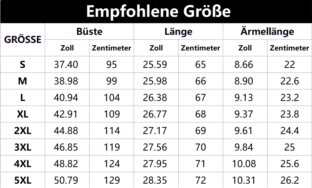 • Vorschlag: * Diese Daten wurden durch manuelle Messung des Produkts erhalten und können um 0,03-0,06 Zoll/1-3 Zentimeter abweichen.